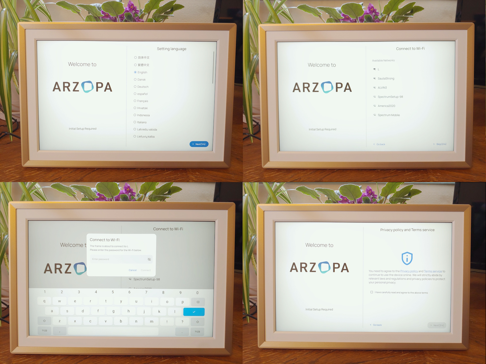 İlk donanım kurulumu, dil seçimi, isteğe bağlı Wi-Fi kurulumu, hizmet şartları ve gizlilik politikalarının kabulü ve saat/tarih ayarları gibi çeşitli ekranlardan oluşmaktadır. Kullanıcılar resim çerçevesine erişmek için son ekrandaki QR kodunu arkadaşları ve aileleriyle paylaşabilir veya düğün gibi hediye edilen fotoğrafları görmek için bir hediye kodu ekleyebilir. İnceleme ünitesinde bir ürün yazılımı güncellemesi gerekiyordu ve yüklenmesi birkaç dakika sürdü.