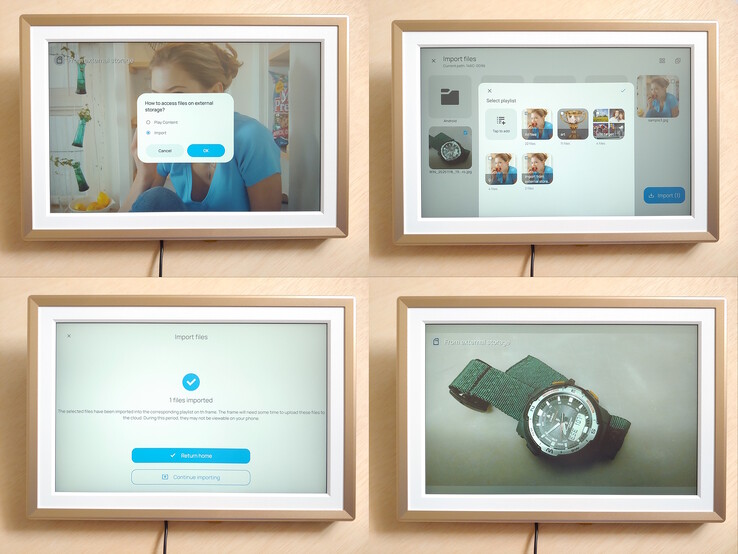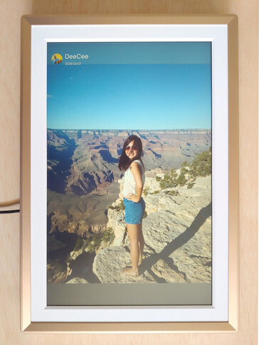 Resim çerçevesi 32 GB dahili depolama alanı ve sınırsız bulut depolama alanı içeriyor. Kullanıcılar isteğe bağlı başlıklar ekleyebilir ve fotoğrafları yatay veya dikey yönlendirme için kırpabilir, ancak gelişmiş düzenlemeler için harici uygulamalar gerekir. Kısa video klipler de destekleniyor.