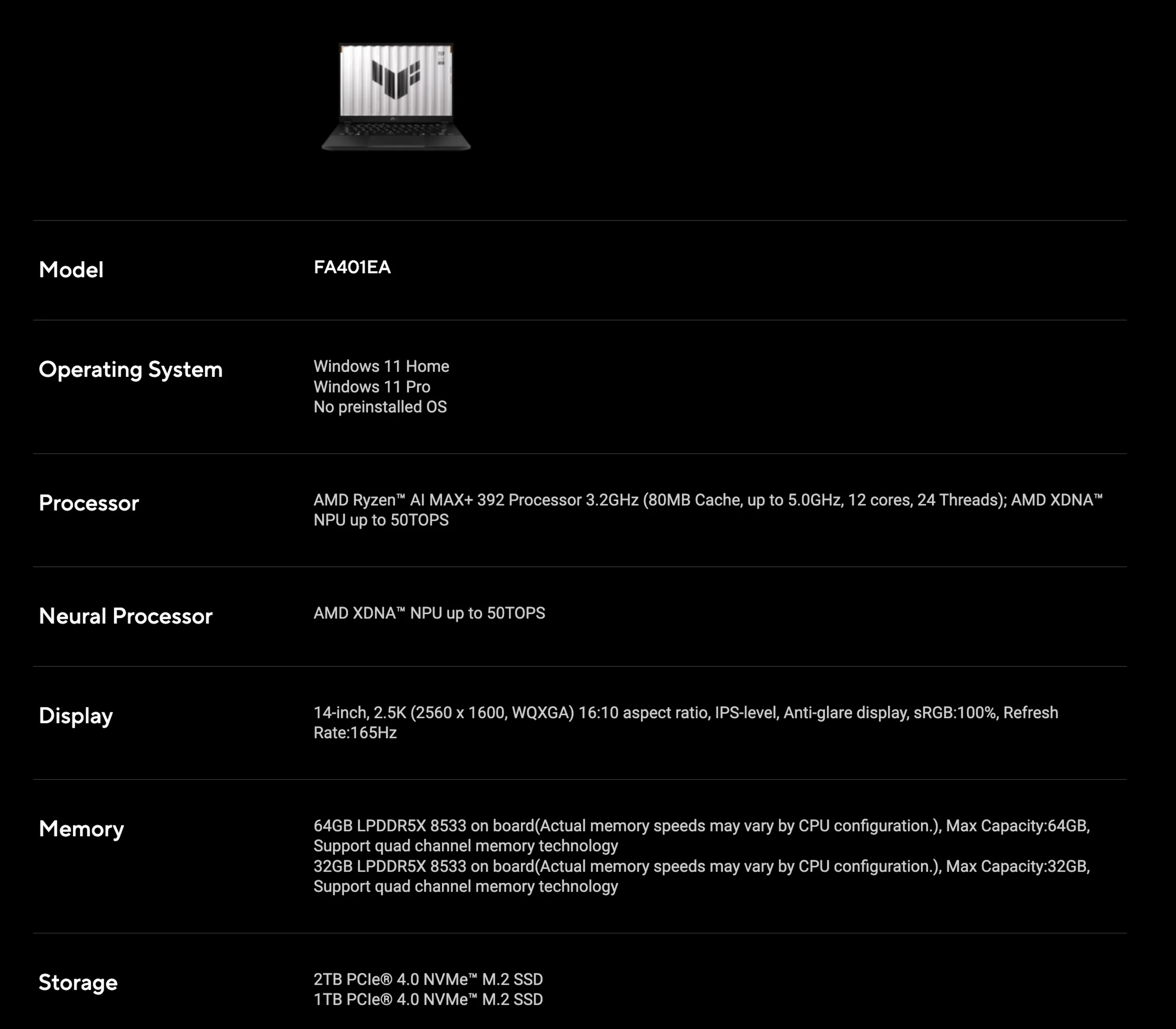 Geçen hafta, Asus piyasaya sürdü ilk AMD Strix Halo destekli dizüstü oyun bilgisayarını birden fazla pazarda satışa sundu. TUF Gaming A14 (FA401EA) olarak satılan dizüstü bilgisayar şu anda AMD'nin Ryzen AI Max+ 392 APU. Ile karşılaştırıldığında daha düşük seviyeli bir seçenek olsa da Ryzen AI Max+ 395 içinde ROG Flow Z13 (Amazon'da şu anda 2.169 dolar), bu yeni APU'nun benzer bir grafik performansı sunması gerekiyor Radeon 8060S iGPU.