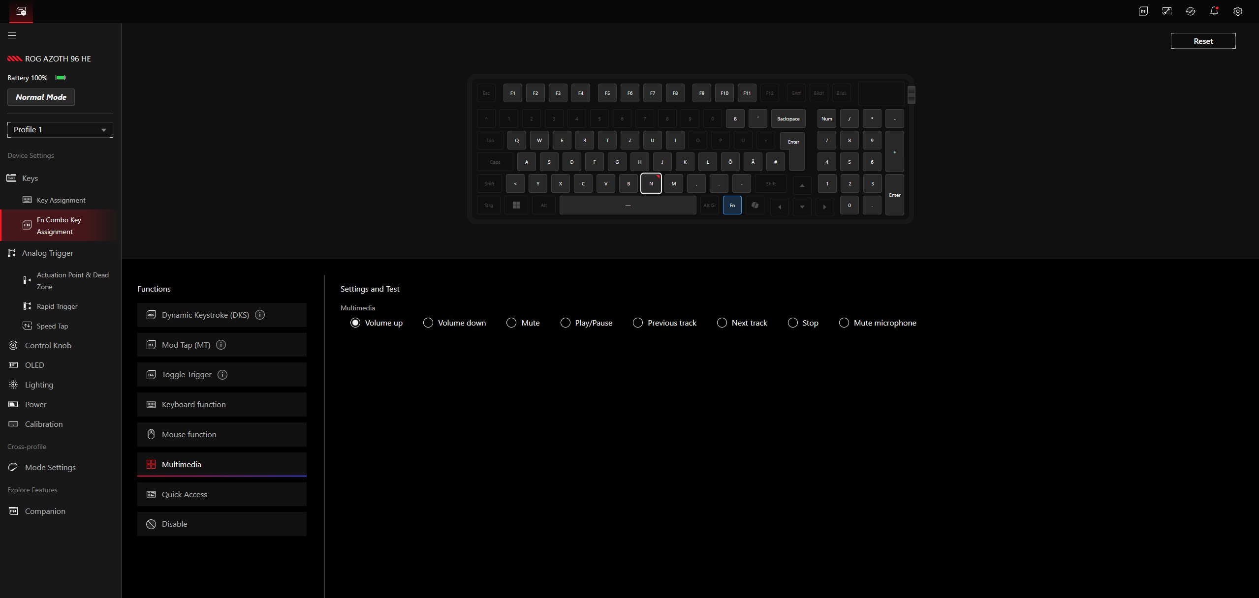 Asus ROG Azoth 96 HE, Gear Link üzerinden yönetilir ve yapılandırılıraçıkça yapılandırılmış bir web arayüzü kullanır. Ek bir uygulama (Gear Link Companion) yüklemek gerekli değildir, ancak bazı ekstra işlevleri etkinleştirir. Seçenek yelpazesi oldukça geniş - örneğin, birden fazla profil oluşturabilirsiniz. Neredeyse tüm tuşlara farklı işlevler atanabilir ve dokunma ve basılı tutma için ayrı eylemler de desteklenir. Ayrıca, bir tuşa ne kadar basıldığına bağlı olarak farklı işlevler tetiklenebilir. Fn tuşları, diğer şeylerin yanı sıra multimedya kontrollerini atamak için kullanılabilir. Gear Link ayrıca her tuş için ayrı bir çalıştırma noktası ayarlamayı da destekliyor.