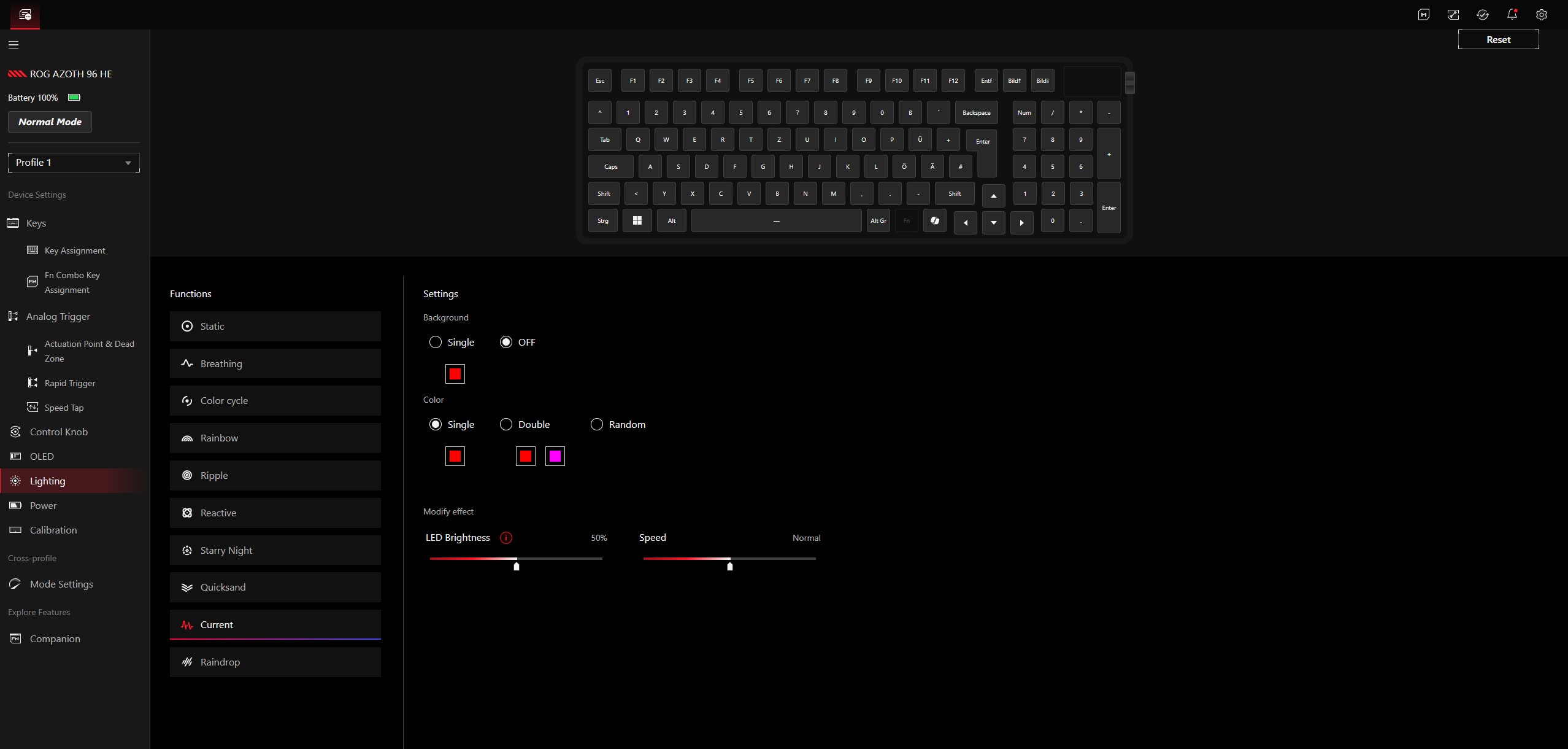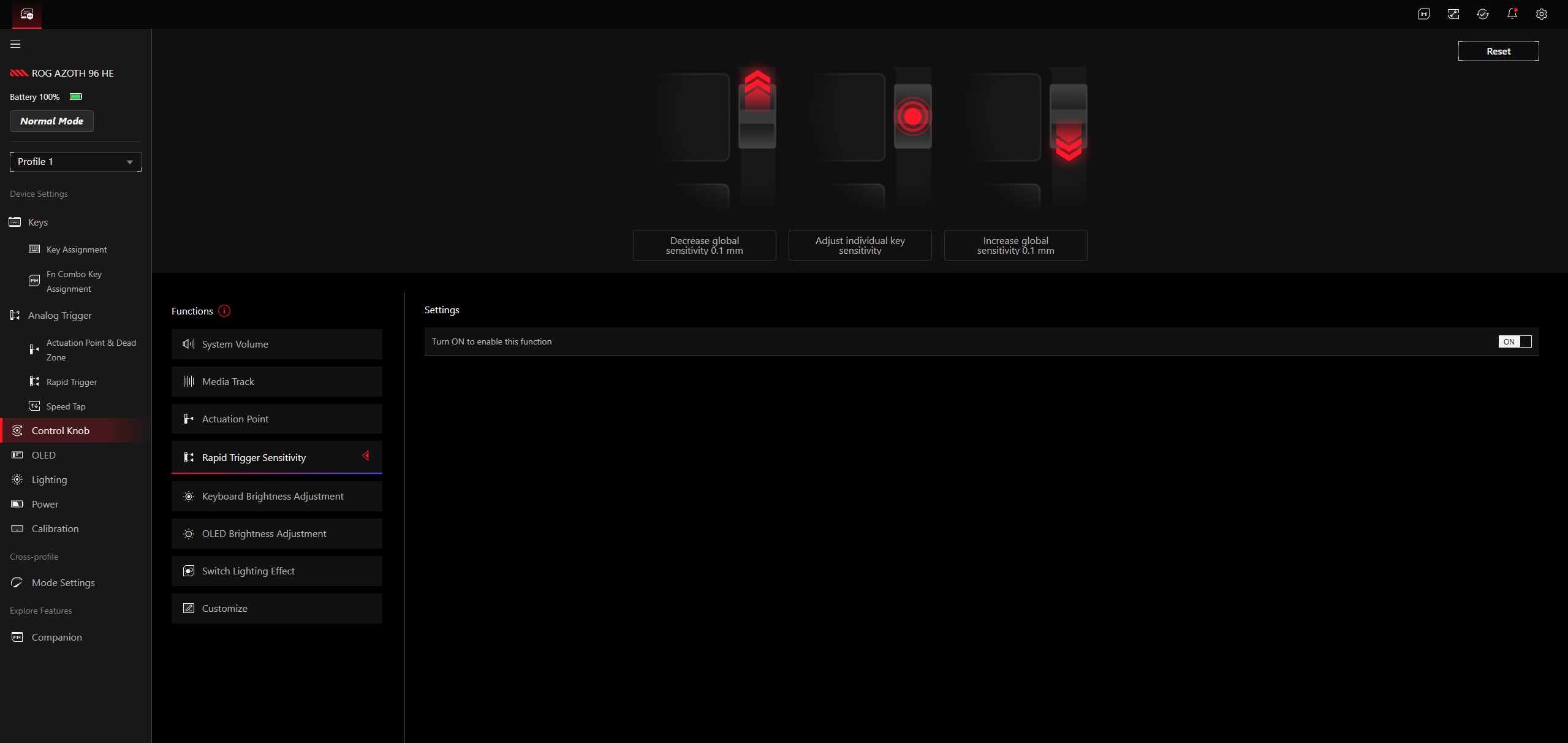 ROG Azoth 96 HE, günlük kullanımda, üretken uygulamalarda ve oyunlarda mükemmel performans gösterir. Optimum çalıştırma derinliğini ayarlamak için biraz zaman ayırmanızı kesinlikle öneririz - bu ayarlanabilirlik, geleneksel bir klavyeye göre büyük bir avantajdır ve pratikte hızlı çalıştırma ile yanlışlıkla girişlerden kaçınma arasındaki en iyi dengeyi bulmayı mümkün kılar. Çalıştırma noktası 0,1 ila 3,5 mm aralığında 0,01 mm'lik adımlarla ayarlanabilir.