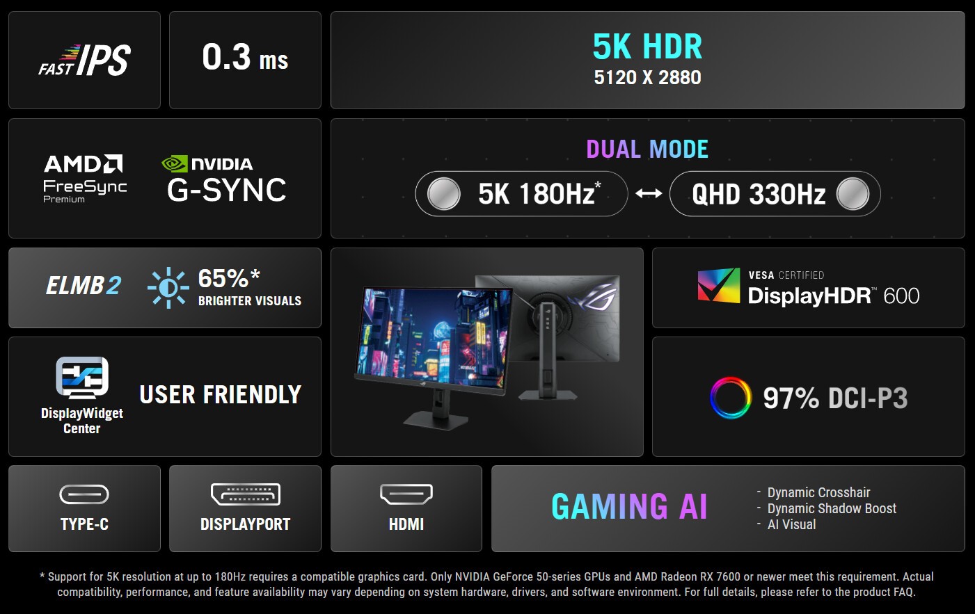 XG27JCG, doğal 5K çözünürlüğünde bile 180Hz'lik akıcı bir yenileme hızına ulaşabiliyor. Söylemeye gerek yok, kullanıcıların bu tavana ulaşmak için oldukça güçlü bir GPU'ya ihtiyacı olacak. Asus, Nvidia GeForce RTX 50 serisi bir kart veya AMD Radeon RX 7600 ve daha yenisi. Diğer oyun özellikleri arasında hem G-Sync hem de FreeSync Premium desteği, 0,3 ms GtG tepki süresi ve hızlı tempolu oyunlarda daha iyi netlik için Extreme Low Motion Blur 2 (ELMB 2) yer alıyor.