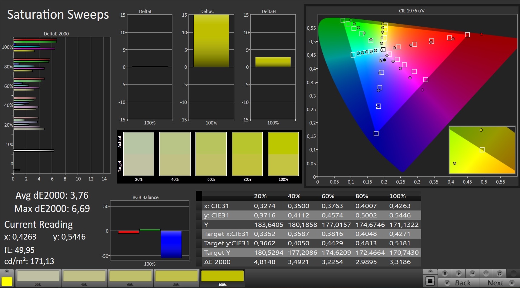 | Colorchecker dE 2000 calibrated * | 2.27 | 1.47 35% | 1.16 49% | 0.98 57% | 0.8 65% |