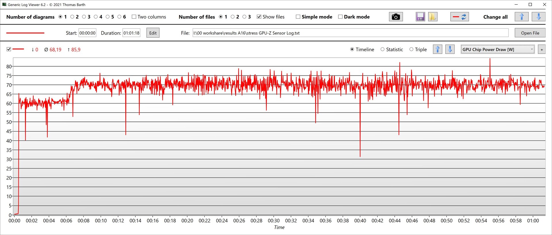 Daha hızlı CPU'ya rağmen, boşta güç tüketimi artmıyor. Aynı durum, A16'nın rakiplerine kıyasla nispeten ekonomik olduğu orta yük (3DMark06) veya oyun için de geçerlidir.