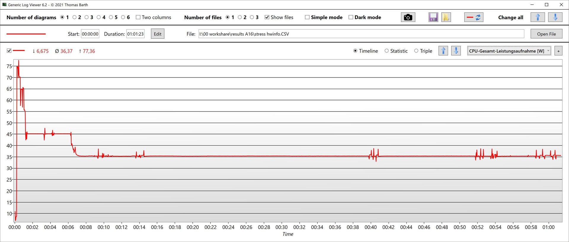 Stres testinde bile A16 oldukça serin kalıyor, bu da CPU'nun TDP'sinin kısa sürede yaklaşık 80 W'tan sabit 35 W'a düşürülmesiyle ilgili.