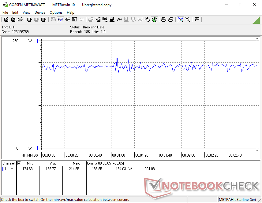 CPU ve GPU'nun her biri yüzde 100 kullanımdayken orta büyüklükteki (~16,5 x 7,6 x 2,5 cm) 240 W AC adaptörden maksimum 248 W çekişi ölçebiliyoruz. Bu oran, termal sınırlamalar nedeniyle aşağıdaki ekran görüntüsünde gösterildiği gibi yalnızca yaklaşık 30 saniye sürmektedir.