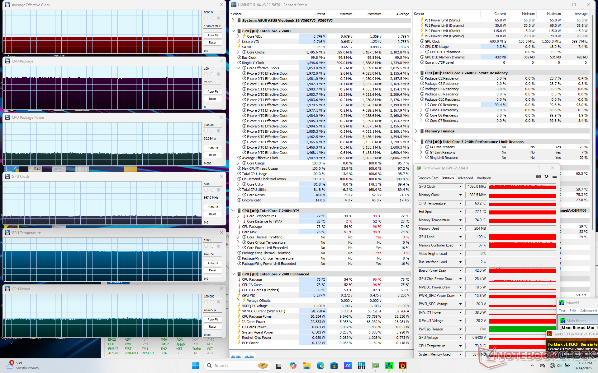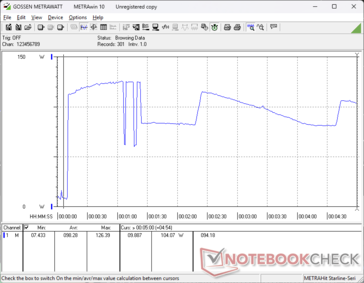Rölantide çalışma, dGPU devre dışıyken sadece 2 W veya dGPU etkin ve maksimum parlaklık ayarındayken 11 W arasında değişebilir. Yukarıda bahsedilen performans azaltma davranışı nedeniyle Prime95 stresini çalıştırırken tüketim çılgınca dalgalanacaktır.