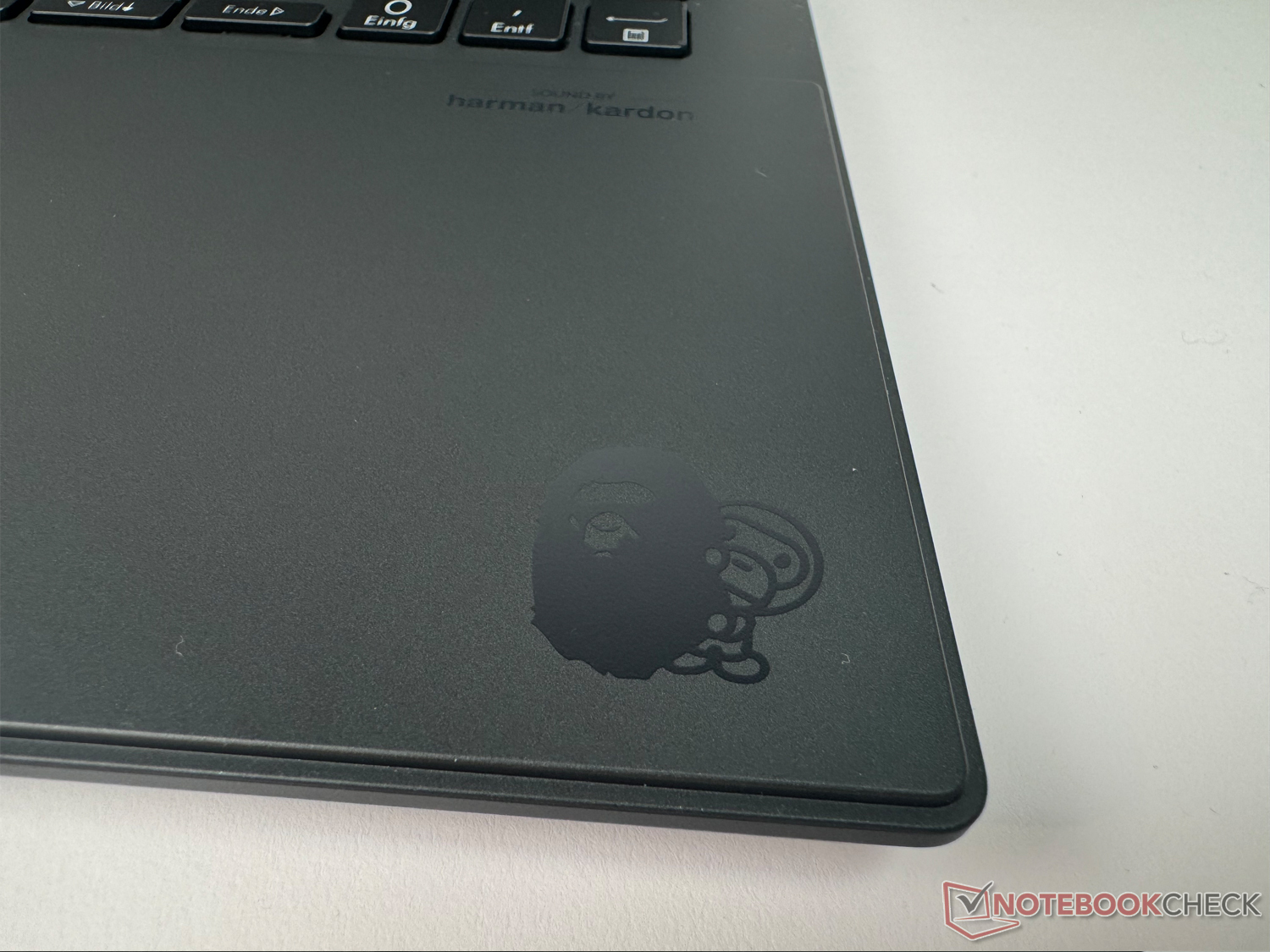 Sokak giyim markası "A Bathing Ape" (BAPE) ile yapılan işbirliği cihaz açıldığında da devam ediyor. Dokunmatik yüzey bile aynı baskılı motife sahip. Buna ek olarak, dizüstü bilgisayarın köşelerinde ve tabanda sevimli maymun sizi karşılıyor. Renk açısından cihaz siyah renkte. Intel Core i5-13500H tabanlı daha zayıf özellikli versiyonu tercih edenler gümüş renkli BAPE modeline sahip oluyor.