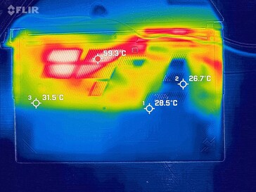 İnceleme örneği, 41 °C'ye varan sıcaklığıyla boşta çalışırken bile nispeten ısınıyor, ancak bu durum rahatsız edici boyutlara ulaşmıyor. Donanım zorlanırsa kasa 62 °C'ye kadar ısınır. Bu rahatsız edici derecede sıcak bir sıcaklıktır, ancak en sıcak bölgeler sayısal tuş takımının yanı sıra ünitenin tabanına yakın yerlerde bulunabilir.