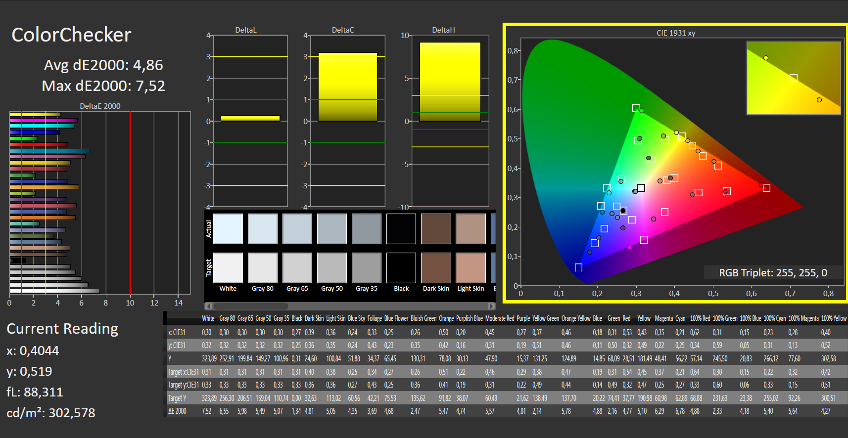 | Colorchecker dE 2000 max. * | 7.52 | 6.03 20% | 6.7 11% | 4.7 37% |