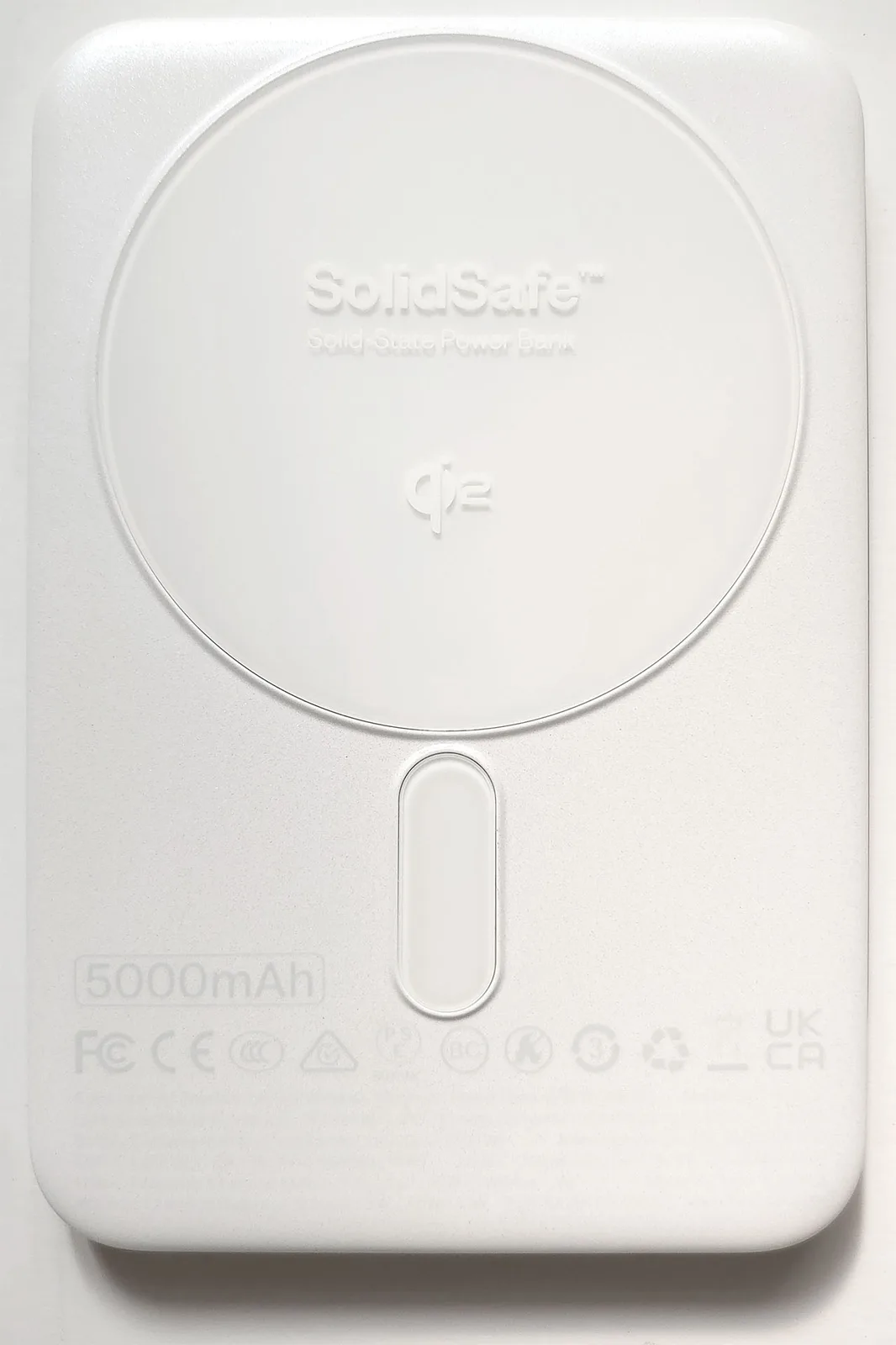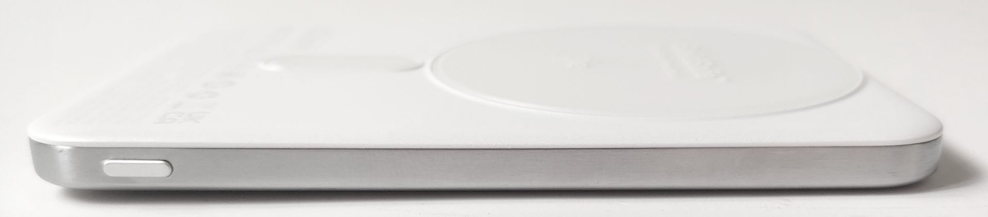 Qi2 manyetik şarj pedi, sedefli beyaz bir renge sahip olan plastik alt kısımda yer almaktadır. Dairesel ped yaklaşık 0,5 mm (0,02 inç) çıkıntı yapar, bu nedenle metal kapak yukarı bakacak şekilde düz bir yüzeye yerleştirildiğinde ve logonun etrafındaki alan aşağı bastırıldığında güç bankası hafifçe sallanacaktır.