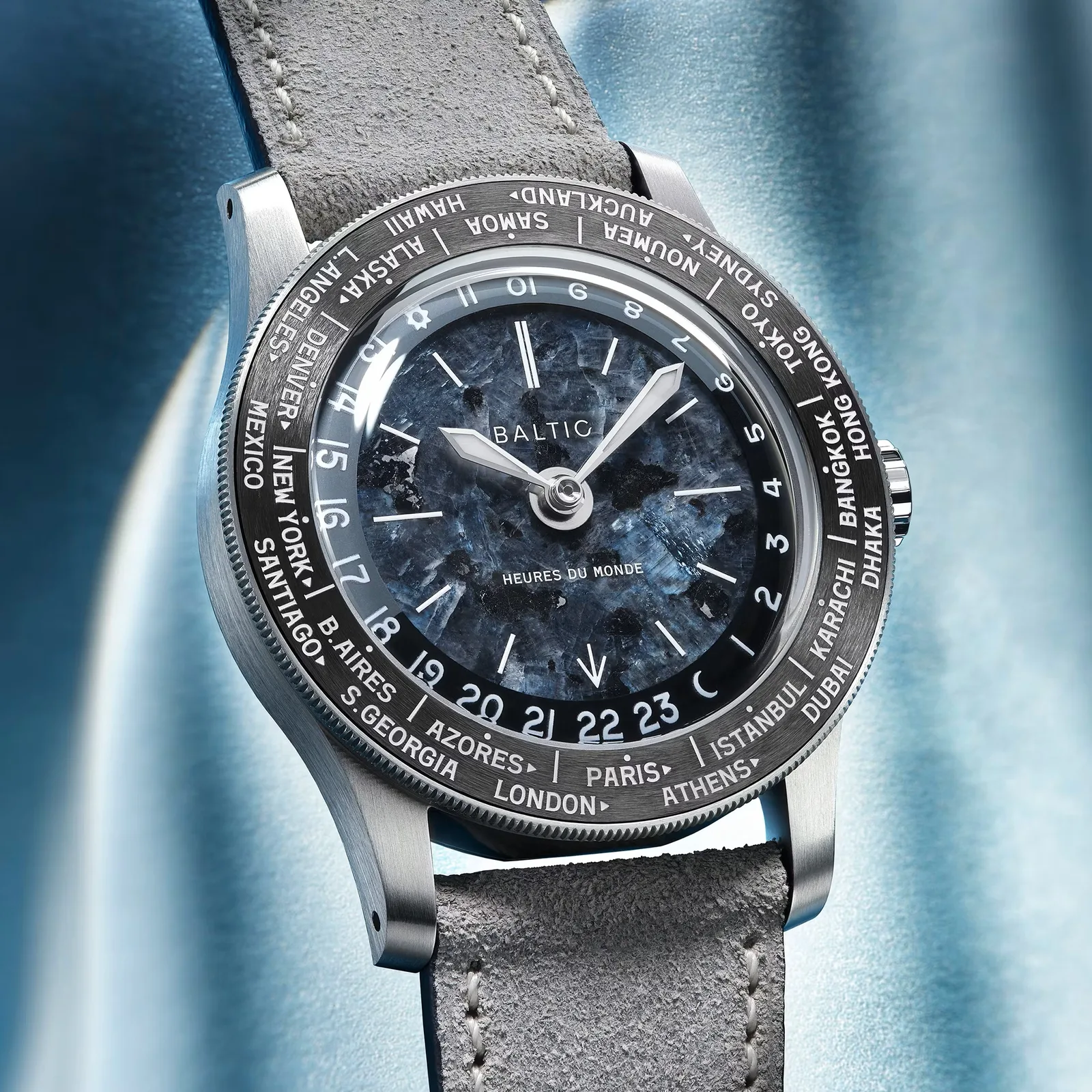 Baltic, neo-vintage ürünleriyle tanınan bir Fransız mikro markası mekanik saatlervintage tasarıma sahip en yeni Heures du Monde saatini resmi olarak tanıttı. Saat, dünya saati işlevi için uygun zaman dilimine uyacak şekilde döndürülebilen 120 klikli bir çerçeve ile tamamlanan 37 mm'ye 11,3 mm paslanmaz çelik bir kasaya sahiptir. Bezel üzerinde Super-LumiNova BGW9 ile kaplanmış toplam 24 büyük şehir bulunmaktadır.