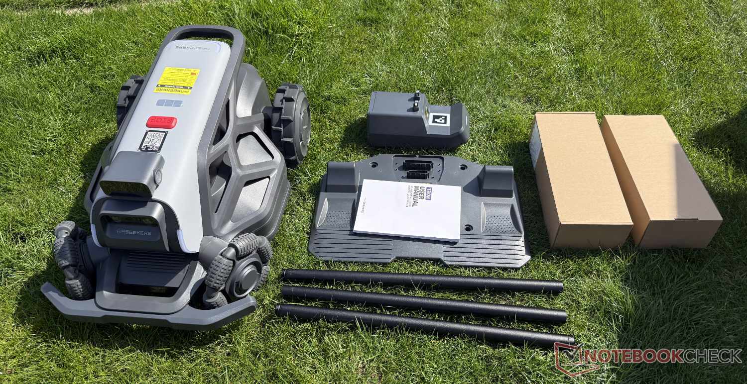 Teslimat kapsamında birçok parça bulunmaktadır. Robotik çim biçme makinesine ek olarak, üç parçalı tüplü ve zemin çivili RTK baz istasyonu, şarj istasyonu (hala birbirine vidalanması gerekiyor), iki şarj cihazı, altı yedek bıçak, aletler ve koruyucu plaka, 32 kg ağırlığındaki 80 x 50 x 45 cm'lik kutuya dahildir.