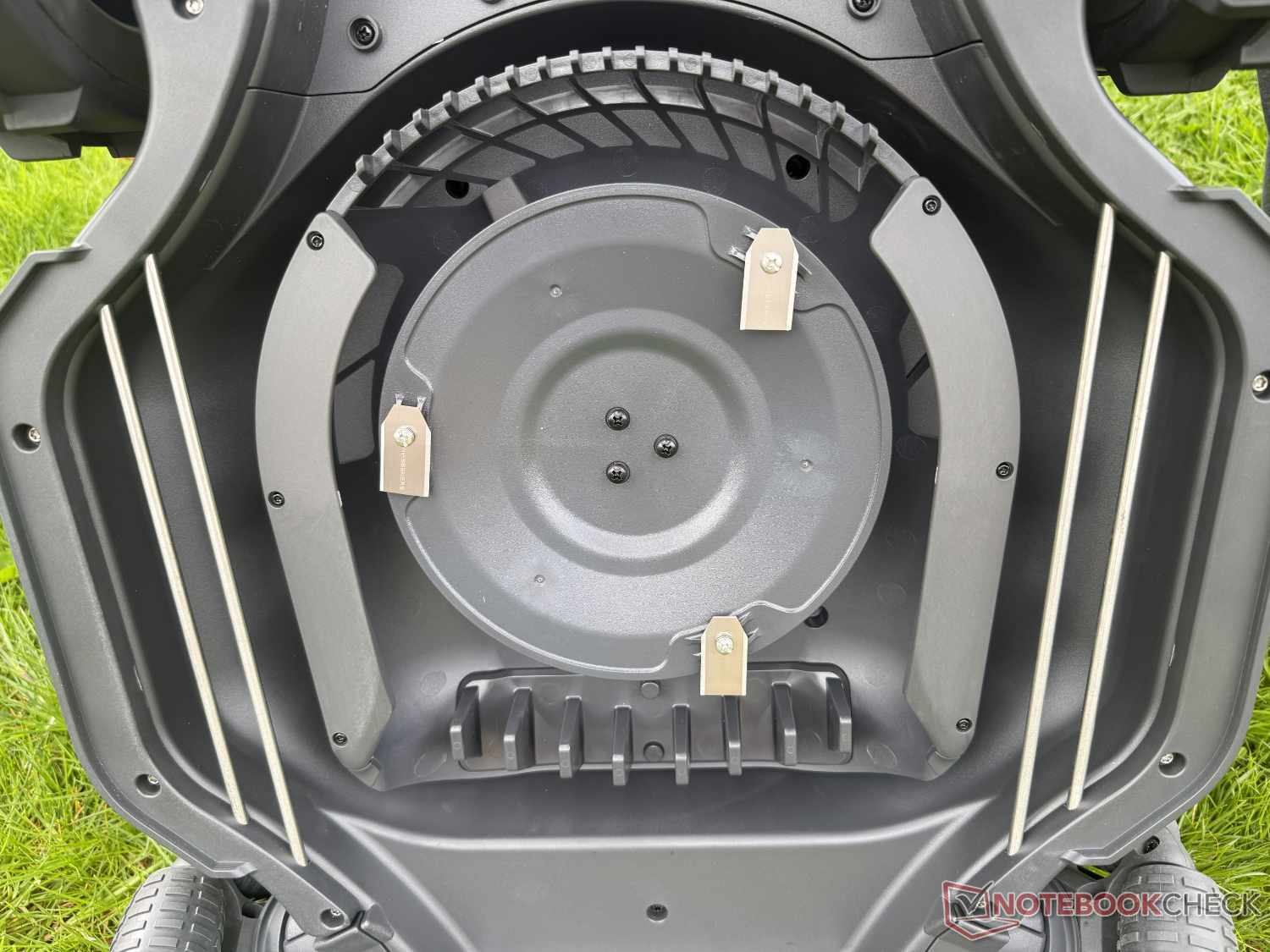 Robotik çim biçme makinesinin cömert boyutlarına rağmen, çift biçme makinesi ile değil, tek bir biçme diski ile biçer. 22 cm ile standart bir boyuttadır ve özel bir özelliği vardır. İkisi üst üste olmak üzere toplam altı bıçak, iyi bir santimetre aralıkla monte edilmiştir. Bunlar yalnızca çimi 30 ila 90 mm (10 mm'lik artışlarla seçilebilir) arasında ayarlanan yükseklikte kesmek için değil, aynı zamanda ultra ince bir çim kesimi üretmek için de tasarlanmıştır. Üretici buna FlowCut malçlama adını veriyor. Alternatif olarak, 300 mm'lik daha büyük bir biçme diski 50 $ karşılığında sonradan takılabilir.