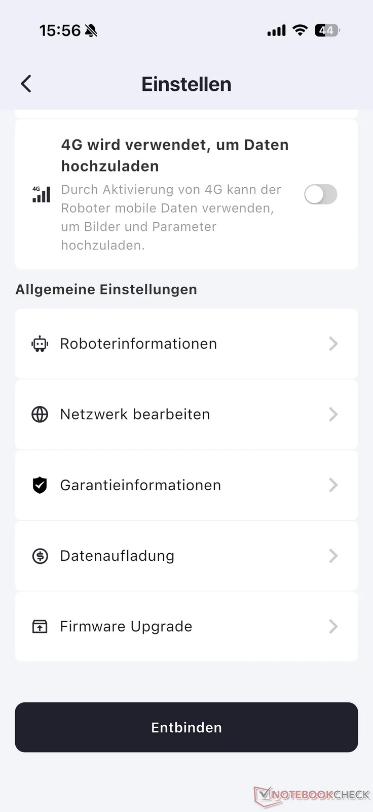 Sağ üstte, ayarları açmak için klasik dişli çark bulunmaktadır. Bu, kilometreye genel bir bakışın yanı sıra RTK/nRTK, gece modu, biçme sırası, 4G aktivasyonu ve veri şarjının yanı sıra ürün yazılımı güncellemeleriyle ilgili temel seçenekleri listeleyen bir menü açar. Engel algılama hassasiyetini ayarlamak için herhangi bir seçenek yoktur.