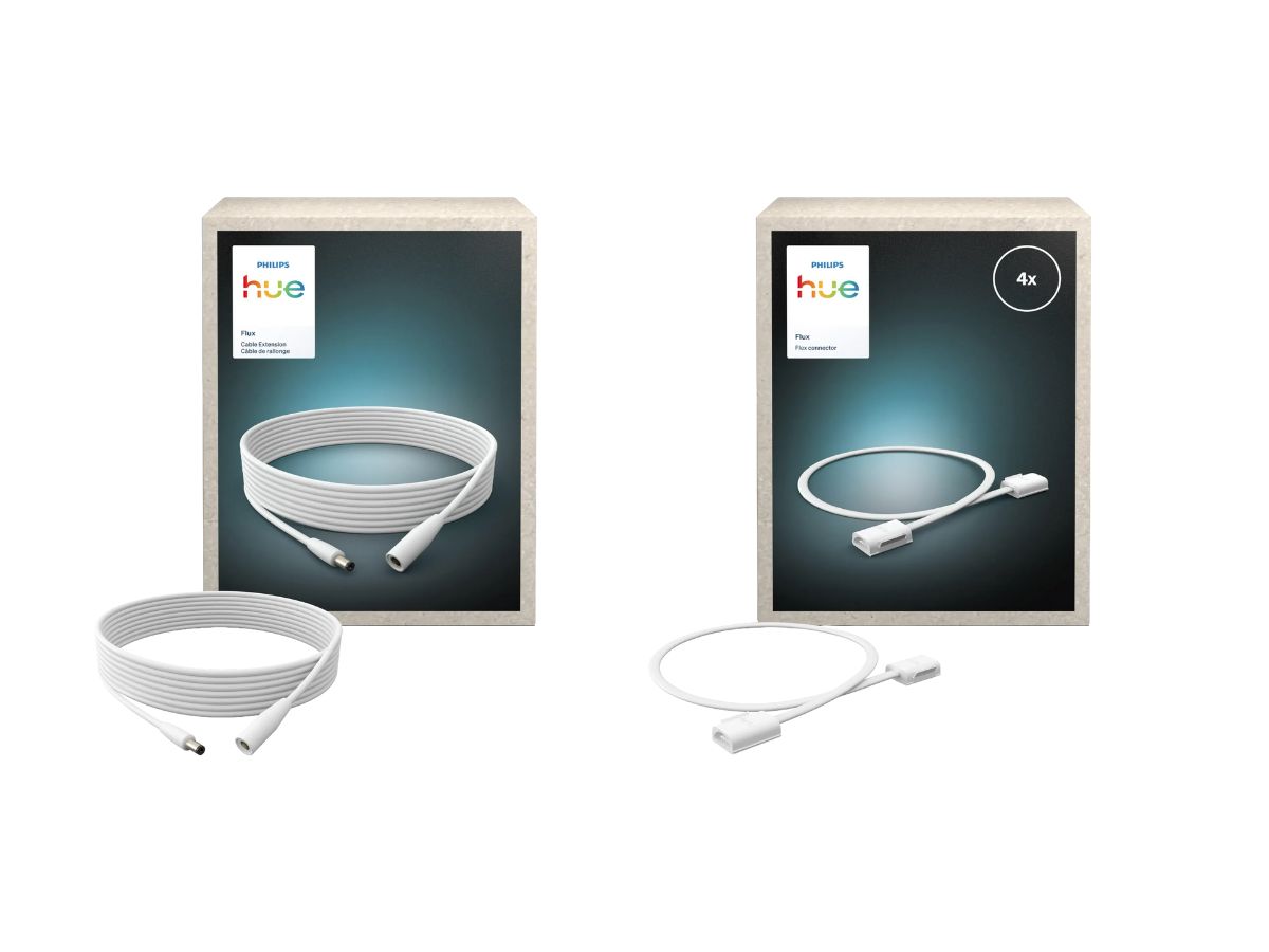 Hue Flux Konektörü I şeklindeyken, Flux Köşe Konektörü L şeklindedir. Her ikisi de daha uzun bir uzunluk oluşturmak için Flux ışık şeridinin parçalarını bağlamak için kullanılabilir. Flux Flex Konektörü, iki ışık şeridi bölümünü uzak mesafeden bağlamanın alternatif bir yoludur, ancak bu aydınlatmada bir kesintiye neden olacaktır. Flux Kablo Uzatması, ışıkların güç kaynağından daha uzak bir mesafeye yerleştirilmesini sağlar. Ayrıca, Flux montaj braketi, şeffaf klips tasarımıyla ışık şeridini bir duvara veya tavana tutturmak için kullanılabilir.