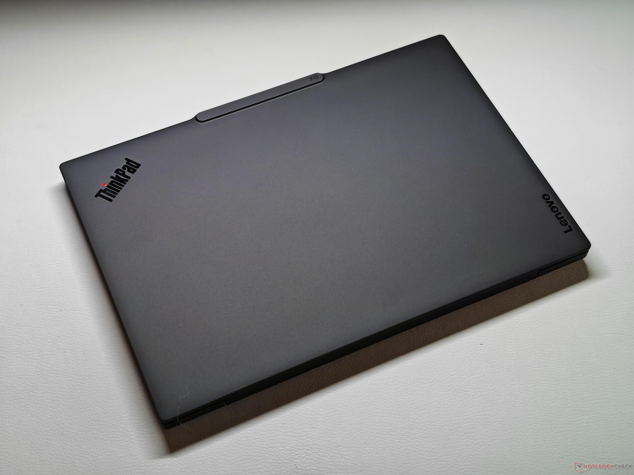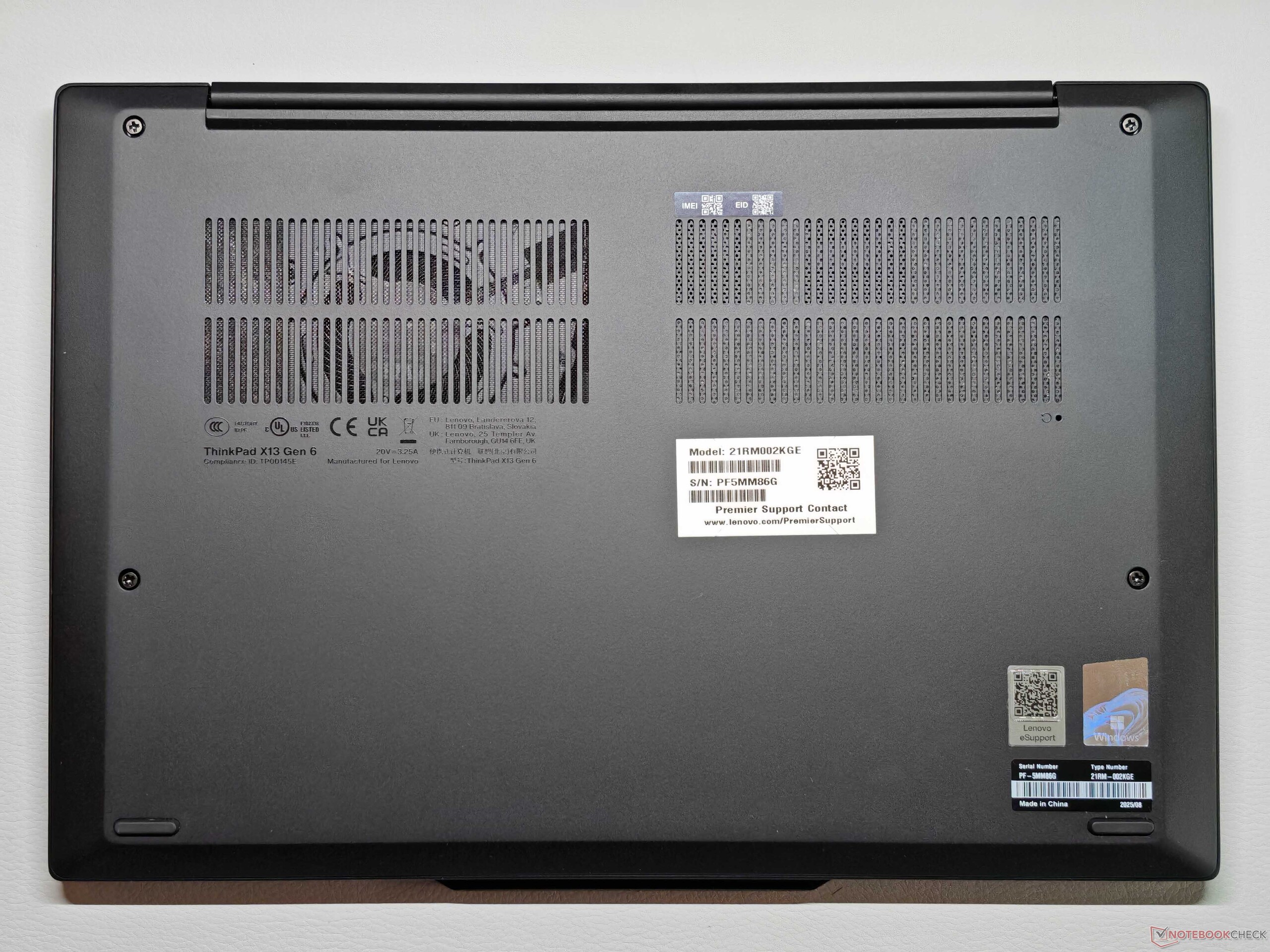 Görsel olarak, yeni X13 G6 açık bir şekilde bir ThinkPad ve oldukça belirgin kamera muhafazası da dahil olmak üzere mevcut tasarım dilini takip ediyor. Cihazı tutarken kompakt boyutu ve düşük ağırlığı hemen fark ediliyor. Yüzeyler, üstün bir his veren, parmak izlerine aşırı eğilimli olmayan ve temizlenmesi nispeten kolay olan hafif dokulu bir yüzeye sahip. Kapak karbon fiber takviyeli plastikten ve ana ünite alüminyumdan yapılmıştır. Bununla birlikte, mobiliteye odaklanmanın genel sertlik üzerinde bir etkisi vardır. Ana ünite merkezi alanda hafifçe bastırılabilir ve büküldüğünde hafif gıcırtı sesleri çıkarır. Kapağın kendisi oldukça sağlam, ancak asıl sorun menteşeler. Maksimum açılma açısı 180 derece, ancak menteşeler biraz fazla gevşek ve çok fazla sallanıyor. Alt kapak sadece dört vidayla sabitlenmiş ve kolayca çıkarılabiliyor. RAM ve WLAN modülü lehimli olmasına rağmen fan, pil, WWAN modülü ve SSD'ye servis verilebilir.