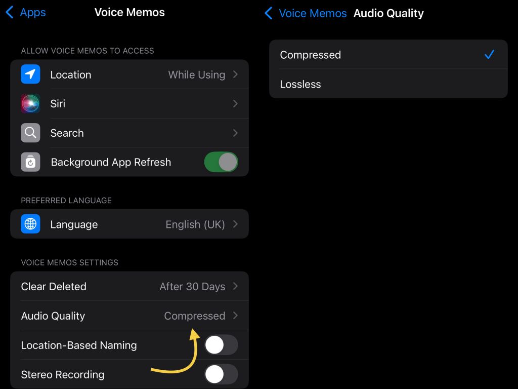 IPhone Ayarlar > Sesli Notlar > Ses bölümüne girerseniz kalite için sıkıştırılmış ve kayıpsız olmak üzere iki seçenek görürsünüz.