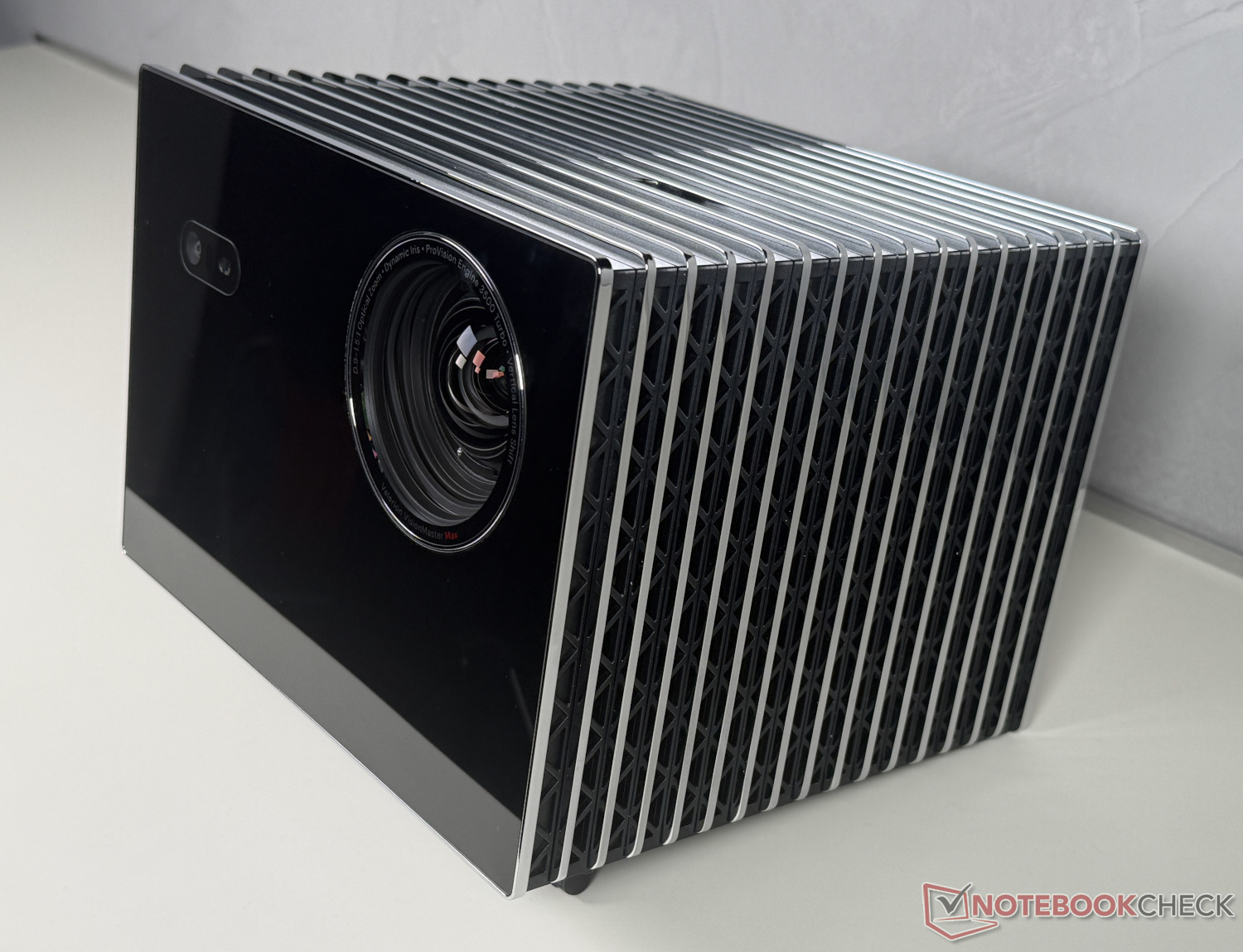 Valerion VisionMaster Max ilk bakışta bile kendini belli ediyor. Yaklaşık 25 x 25 x 20 cm ölçülerinde ve 7,5 kg ağırlığındaki cihaz, deri bir kutu içinde teslim edilir ve parlak siyah gövdesi ve metal çıtalarıyla şık bir tasarıma sahiptir. Bu, projektörü zarif iç mekanlarda bile saklanması gerekmeyen bir tasarım nesnesine dönüştürüyor.