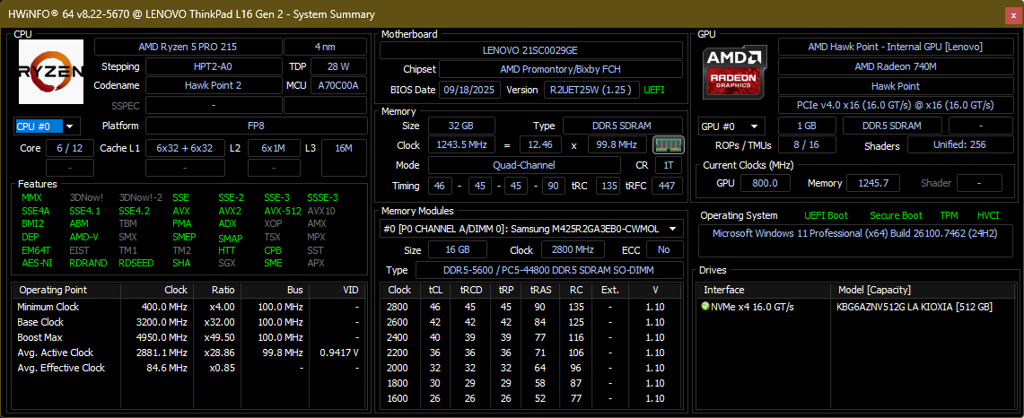 Lenovo ThinkPad L16 Gen 2, selefi gibi eski Zen3+ CPU'lar yerine, çeşitli Zen4 ve Zen5 CPU'lar arasında bir seçim sunarak AMD Ryzen AI 7 Pro 350. dGPU'lar mevcut değildir, çünkü Lenovo yalnızca CPU'ların iGPU'larına güvenmektedir. RAM, iki DDR5-5600 SO-DIMM yuvası sayesinde 64 GB'a kadar yapılandırılabilir. Ve tek bir M.2 2280 NVMe PCIe 4.0 SSD depolamayı yönetir.