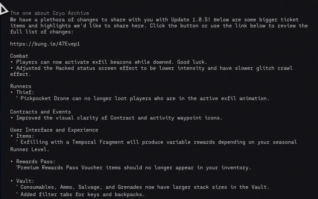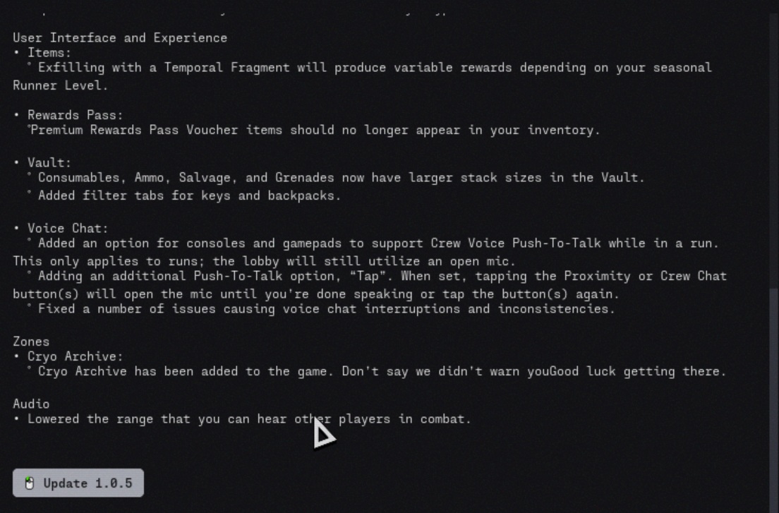 Marathon 1.0.5 güncellemesi yeni Cryo Archive bölgesini ekliyor, oyuncuların yere düştüklerinde çıkış işaretlerini etkinleştirmelerine olanak tanıyor ve savaş, sözleşmeler, kullanıcı arayüzü, sesli sohbet, kararlılık, silahlar, modlar ve sesten oluşan uzun bir değişiklik listesi sunuyor. Bungie ayrıca, yalnızca orada bulunabilen implant avantajları ve modlar da dahil olmak üzere doğrudan Cryo Arşivi'ne birkaç yeni ganimet ilavesi bağladı.