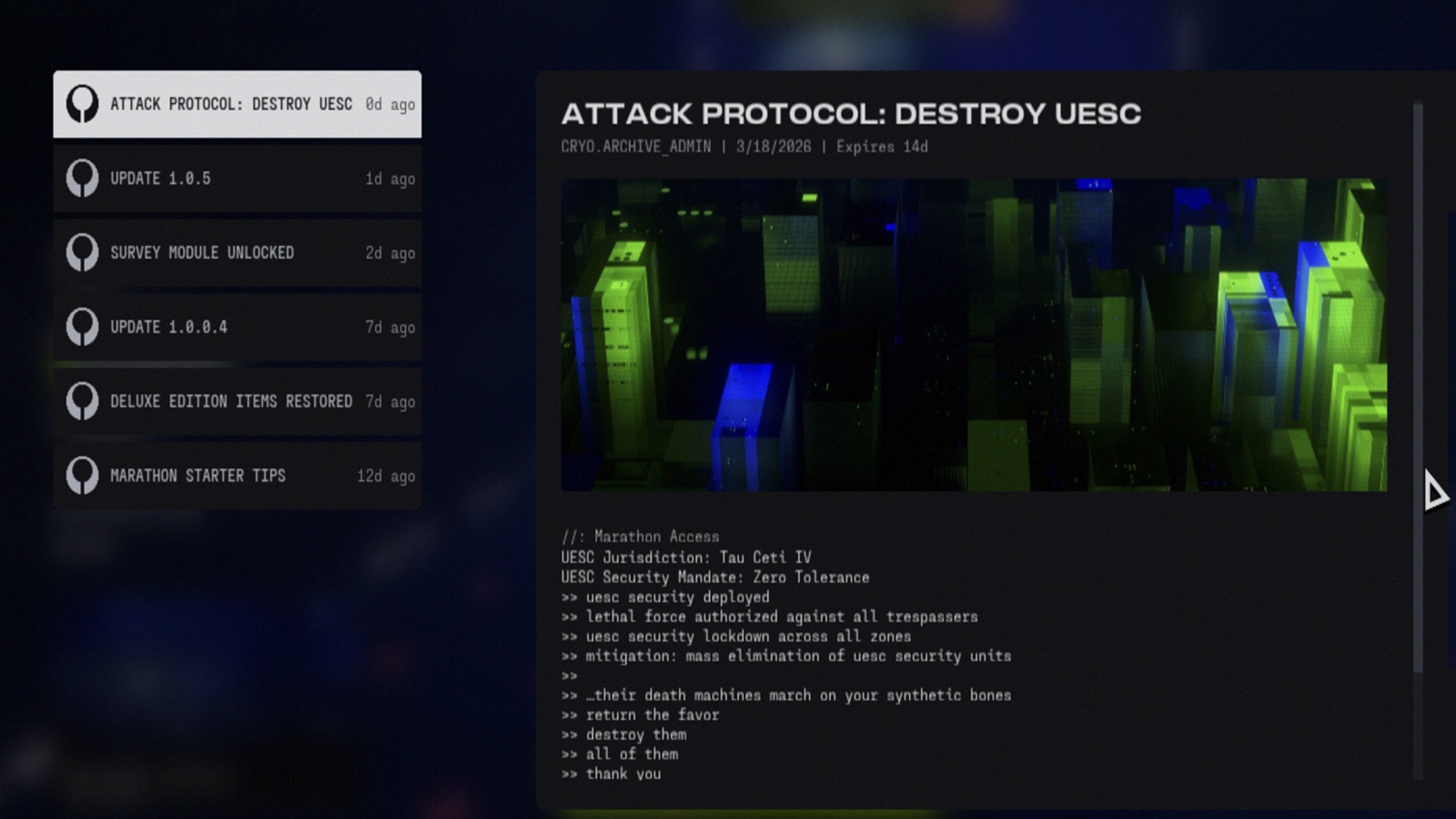 Büyük Marathon güncellemesi 1.0.5, Cryo Arşivi, indirilmiş exfil ve kullanıcı arayüzü ince ayarlarını ekliyor