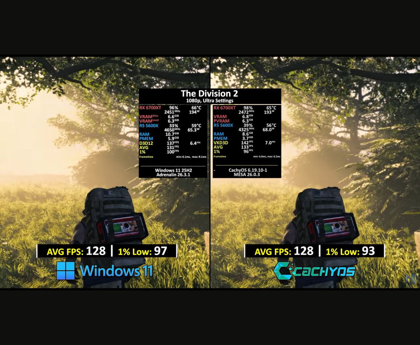 Bununla birlikte, Windows 11, FSR 3 Native ile 1080p Ultra ayarlarda The First Descendant gibi oyunlarda farkı kapattı ve oyunu 63 FPS'de çalıştırırken, CachyOS yalnızca 54 FPS'yi başardı. The Division 2 'yi 1080p Ultra'da çalıştırırken, hem Windows 11 hem de CachyOS 128 FPS'ye ulaşırken, Windows 11 97 FPS ile CachyOS'taki 93 FPS'ye kıyasla %1 daha iyi düşük performans gösterdi.