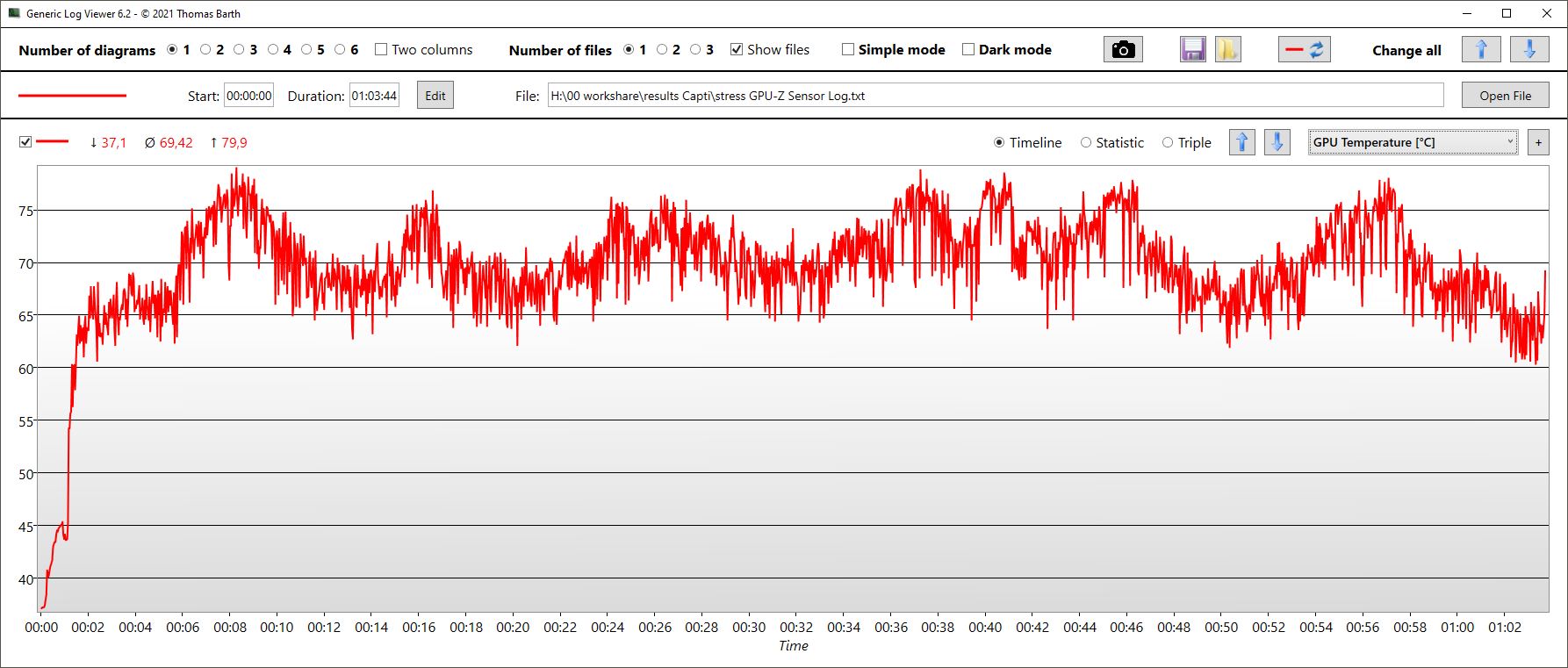 GPU da benzer şekilde tutarlı davrandı: Saati 2.460 MHz, bellek saati 2.000 MHz ve sıcaklık ortalama 69 °C idi.