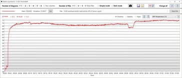 CPU saat hızı, bir saatlik stres testimiz boyunca şaşırtıcı bir şekilde sabit kaldı. Ortalama olarak yaklaşık 3,1 GHz'e ulaşıldı. CPU yaklaşık 72 °C'ye kadar ısındı ve 45 watt'lık sabit bir TDP'ye sahipti.