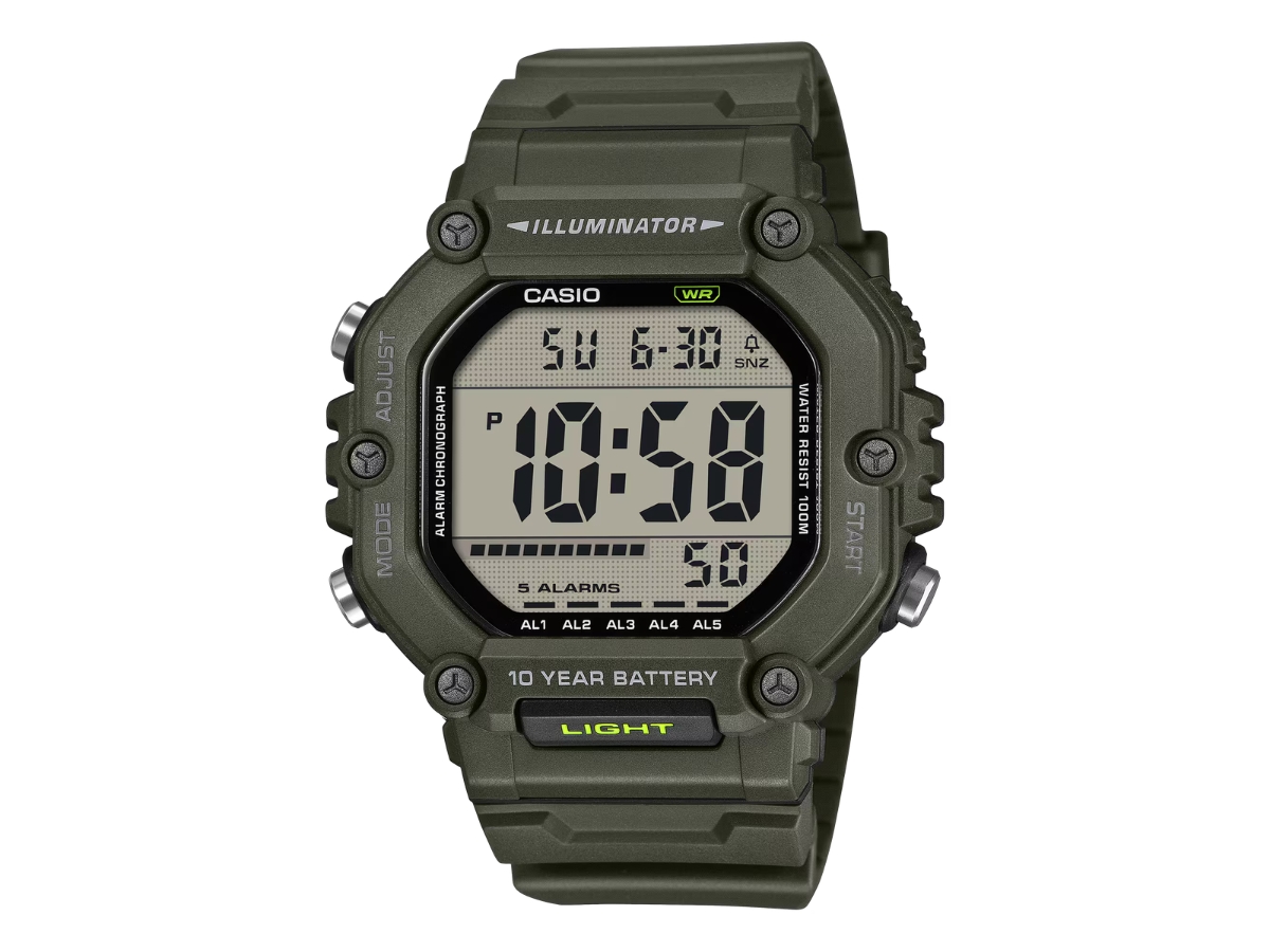 Casio'nun AE-1600'ü kronometre, geri sayım sayacı ve beş günlük alarm gibi araçlara sahip çift zamanlı bir saattir. Dijital ekran, bir düğmeye basılarak amber LED arka ışıkla aydınlatılabiliyor. Diğer dikkat çekici özellikler arasında 100 m su geçirmezlik ve CR2032 pilden 10 yıl daha uzun pil ömrü yer alıyor.