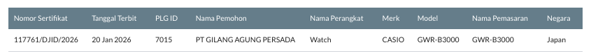 Yeni bir Casio G-Shock modeli yolda: GWR-B3000. Model numarası kısa süre önce Endonezya Posta ve Bilgi Teknolojileri Kaynak ve Ekipman Genel Müdürlüğü (SDDPI) gibi veri tabanlarında tespit edildi.