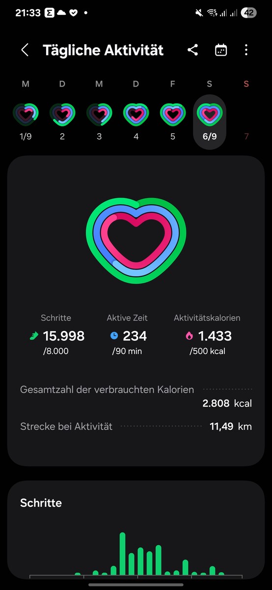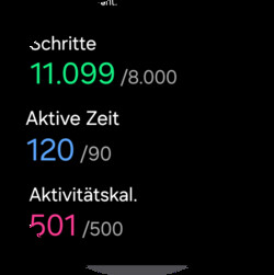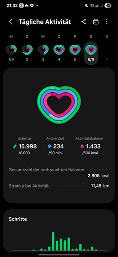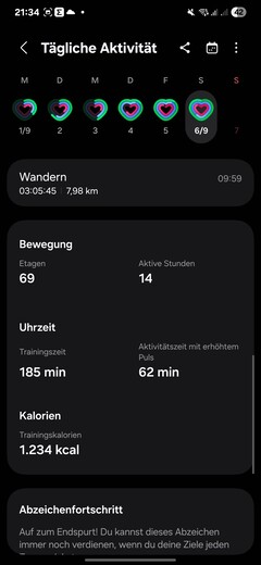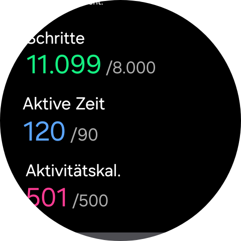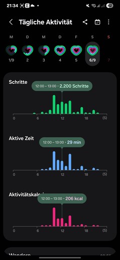 Aktiviteler, hedeflere ulaşıldıkça dolan kalp simgeleri ile temsil edilir. Temel ölçümler arasında adımlar, yakılan kaloriler ve aktif dakikaların yanı sıra mesafe, çıkılan katlar ve egzersiz süresi de yer alıyor.