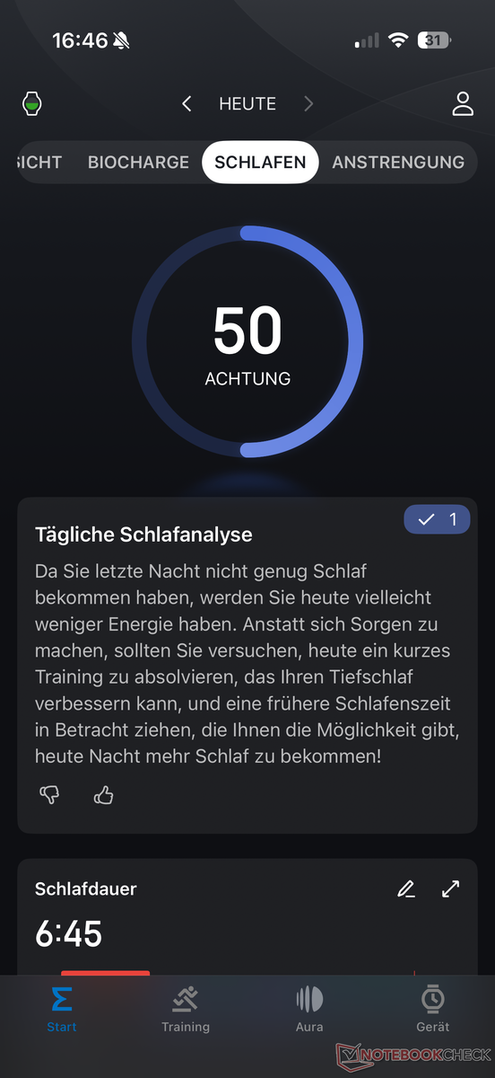 Uyku süresi ve uyku zamanlarına ek olarak, uyku evreleri (derin, REM, uyanık) ve düzenliliği de dahildir. T-Rex 3 Pro, solunum hızına ek olarak uyku sırasında kalp atış hızının değişkenliğini de belirler ve bunu da değerlendirir. Bu aynı zamanda olası hipopne hakkında sonuçlara varılmasını sağlar.