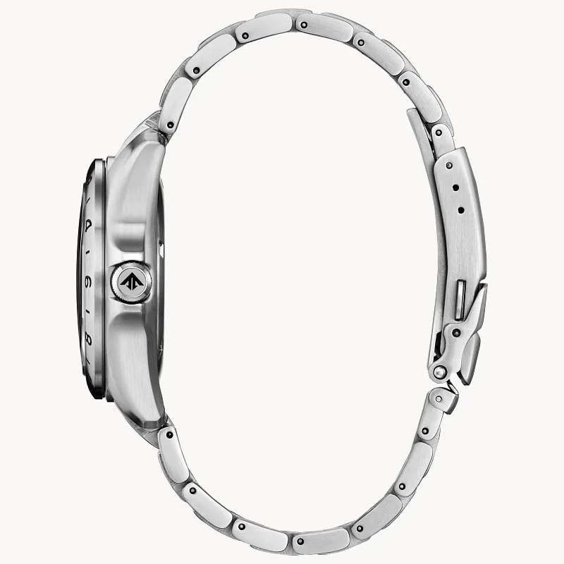 Bu Citizen Promaster serisi yeni bir bordo kadranlı GMT'ye kavuşuyor ve bu model, profesyonel seride yaygın olarak görülen geleneksel siyah ve mavi renk paletlerinden uzaklaşıyor. Endeavor/Land serisinin yapısal DNA'sına sahip olan bu model, dayanıklılık odaklı bir tasarıma sahip 44 mm paslanmaz çelik kasayla donatılmıştır. Birincil özellik, sarı bordürlü ok uçlu özel bir GMT ibresi ve kazınmış, sabit 24 saatlik dış çerçeve ile kolaylaştırılan çift zaman özelliğidir. BJ7140 serisinde dahili dönen pusula halkaları kullanan önceki modellerin aksine, bu modelde bunun yerine yüksek kontrastlı Arap rakamları ve basitleştirilmiş bir çerçeve kullanılmıştır.