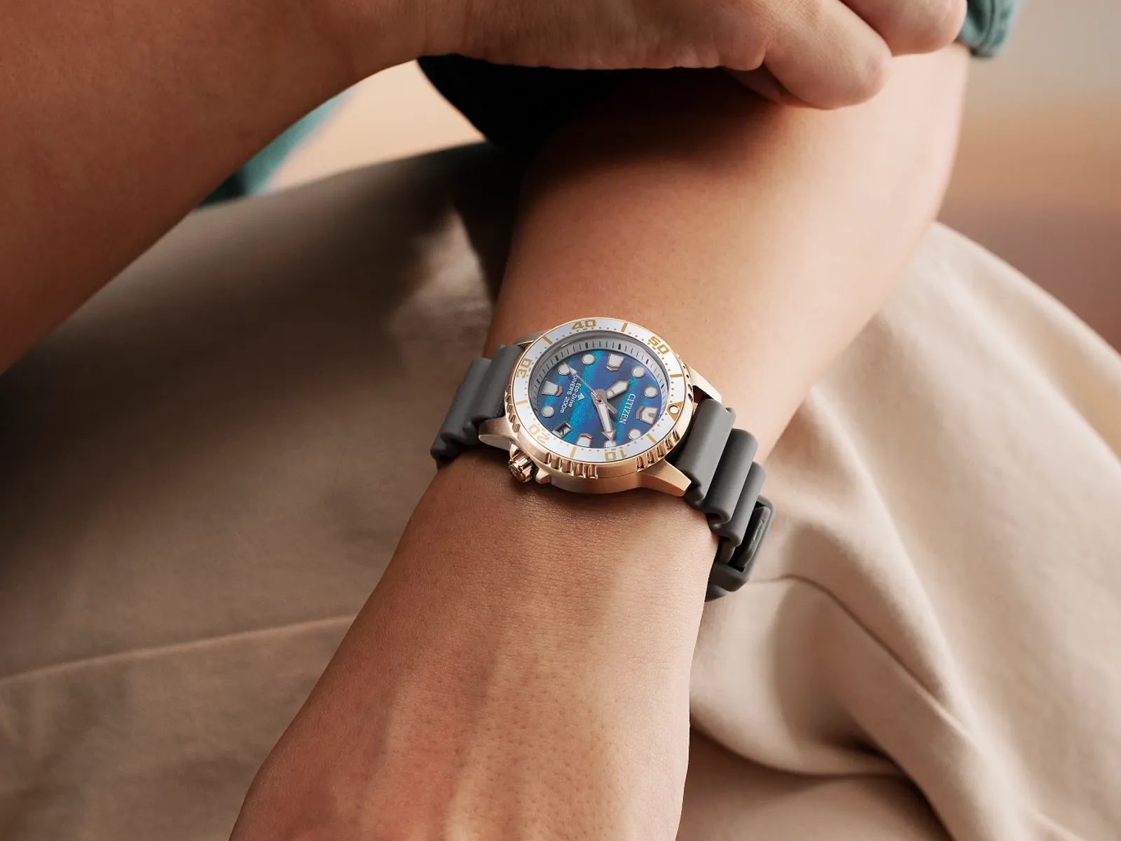 Saat, Citizen'in kendi Eco-Drive E168 mekanizması ile çalışıyor ve bu mekanizma saati herhangi bir ışık kaynağından şarj ederek pil değiştirme ihtiyacını ortadan kaldırıyor. Kompakt 36,5 mm pembe altın tonlu paslanmaz çelik kasaya sahip olan saat, Citizen'in ürün yelpazesindeki, özellikle daha küçük bilekler için daha giyilebilir dalış seçeneklerinden biridir ve BENEBiOL'un bitki bazlı malzemeden yapılmış PU kayışı ile donatılmıştır.