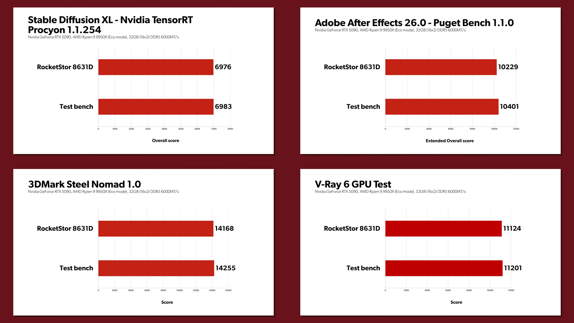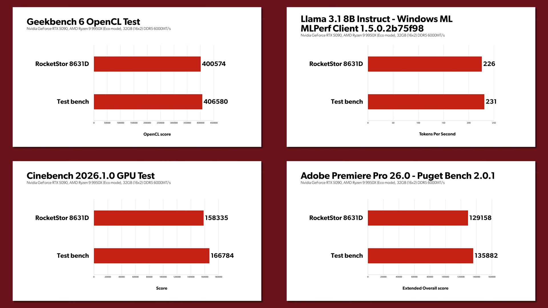 PCWorld bir CopprLink kurulumunu bir masaüstü Nvidia RTX 5090 ile test etti. Bu kurulumda HighPoint'in CopprLink kablolamasına dayanan RocketStor 8631D'si kullanıldı. Ancak normal bir eGPU kurulumundan farklı olarak bu kurulum doğrudan bir masaüstü bilgisayara, dizüstü bilgisayara ya da taşınabilir oyun bilgisayarına bağlanamıyor.