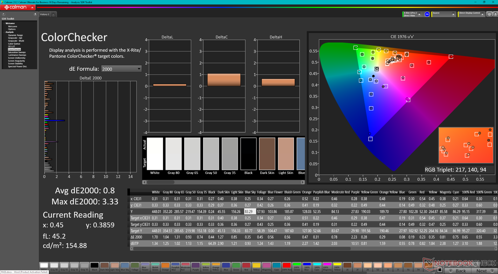 | Colorchecker dE 2000 calibrated * | 0.8 | 1.08 -35% | 0.77 4% | 0.7 12% | 0.45 44% | |