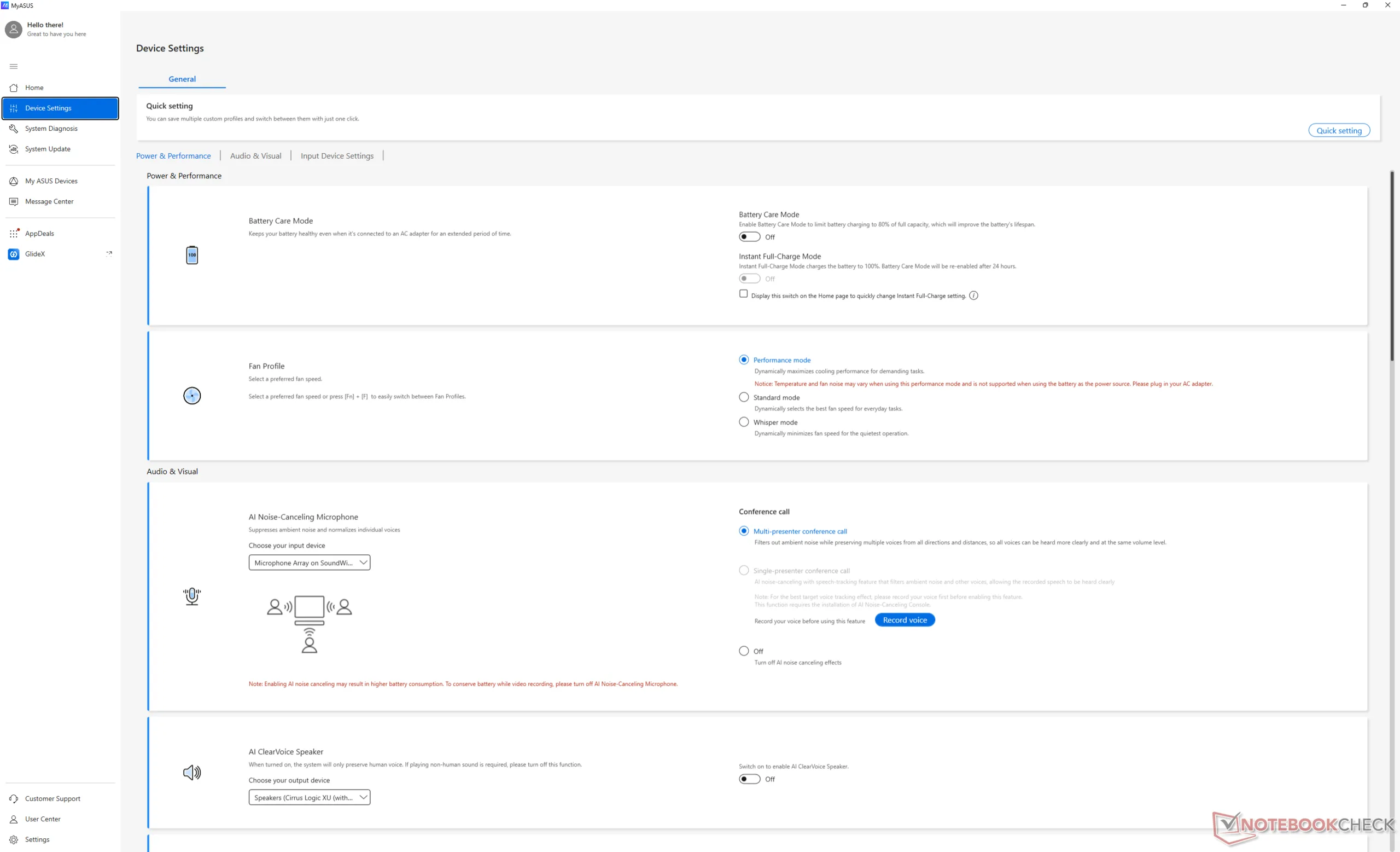 Üzerinde Asus ExpertBook Ultrabununla birlikte, maksimum işlemci performansı bir koşulla birlikte gelir: şebeke gücü. Aşağıdaki ekran görüntülerinde gösterildiği gibi, pille çalıştırmak performansı yaklaşık yüzde 10 ila 15 oranında yavaşlatabilir. Hatta MyAsus yazılımı bunu "güç kaynağı olarak pil kullanıldığında bu performans modu desteklenmez" şeklinde kırmızı bir metinle onaylıyor.