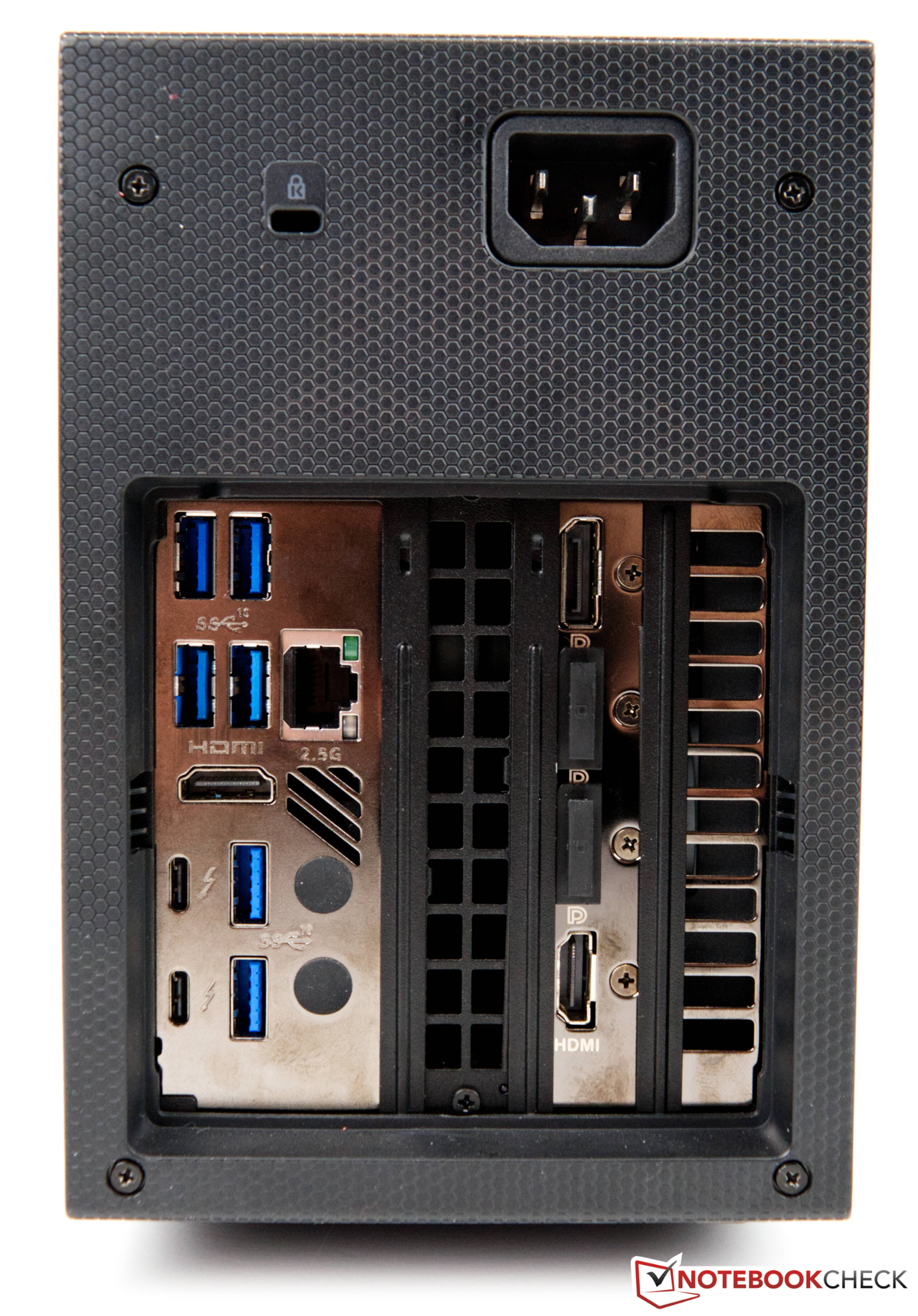 Arkada 6x USB 3.1 Gen2 Type-A ve Thunderbolt 4 dahil olmak üzere iki USB-C bağlantı noktası vardır. HDMI veya USB-C aracılığıyla aynı anda üç adede kadar ekran çalıştırılabilir ve sistemi bilgisayara bağlamanın iki farklı yolu vardır. ağ — WiFi 6E veya 2.5 Gbit LAN. Her biri maksimum 32 GB olan iki SO-DIMM RAM modülü, hesaplama öğesinin kendisine takılabilir. Ayrıca, üç M.2 SSD için yer vardır.