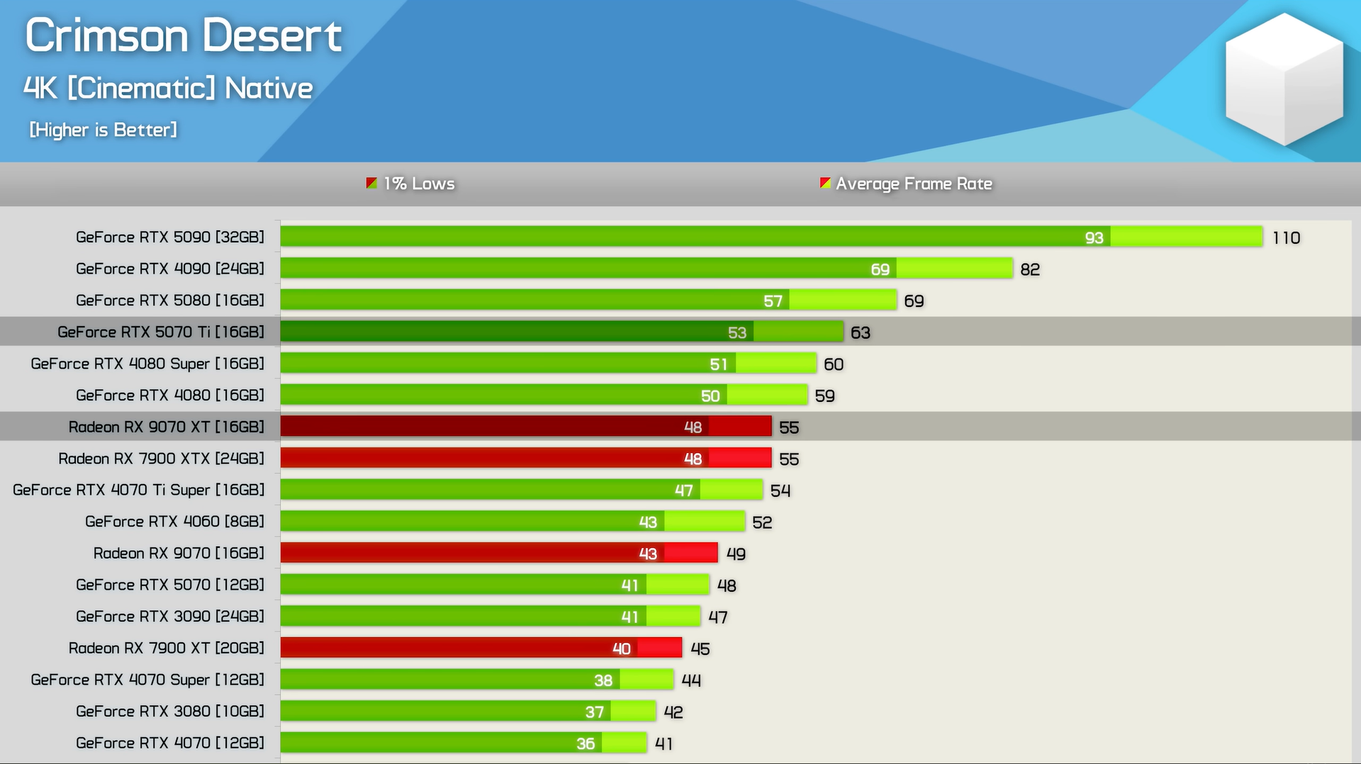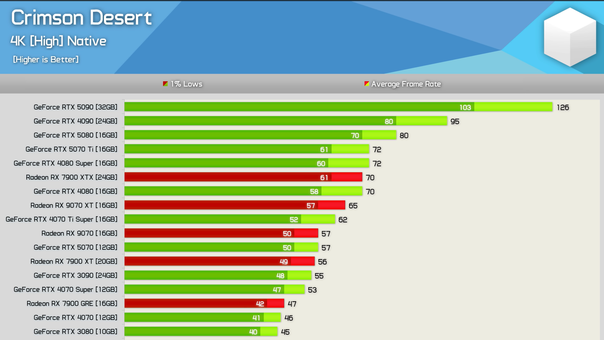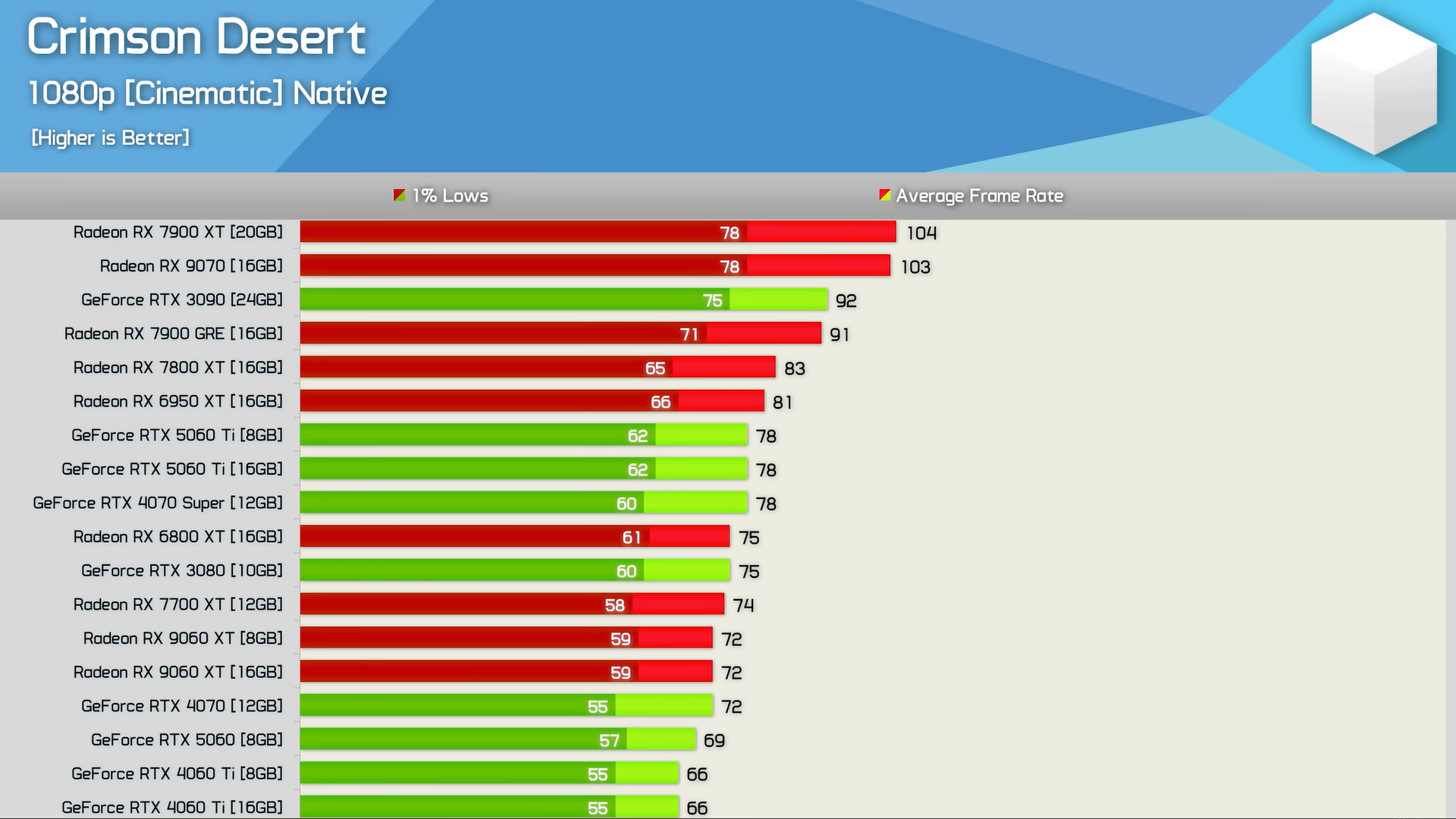 Hardware Unboxed, Crimson Desert'ın performansını 40 GPU ve bir Ryzen 7 9800X3D ile ölçtü. Crimson Desert 'ın RX 7600 gibi mütevazı GPU'larla bile istikrarlı bir 60 FPS'de çalıştığı gösterildiğinden, sonuçlar kendileri için konuşuyor.