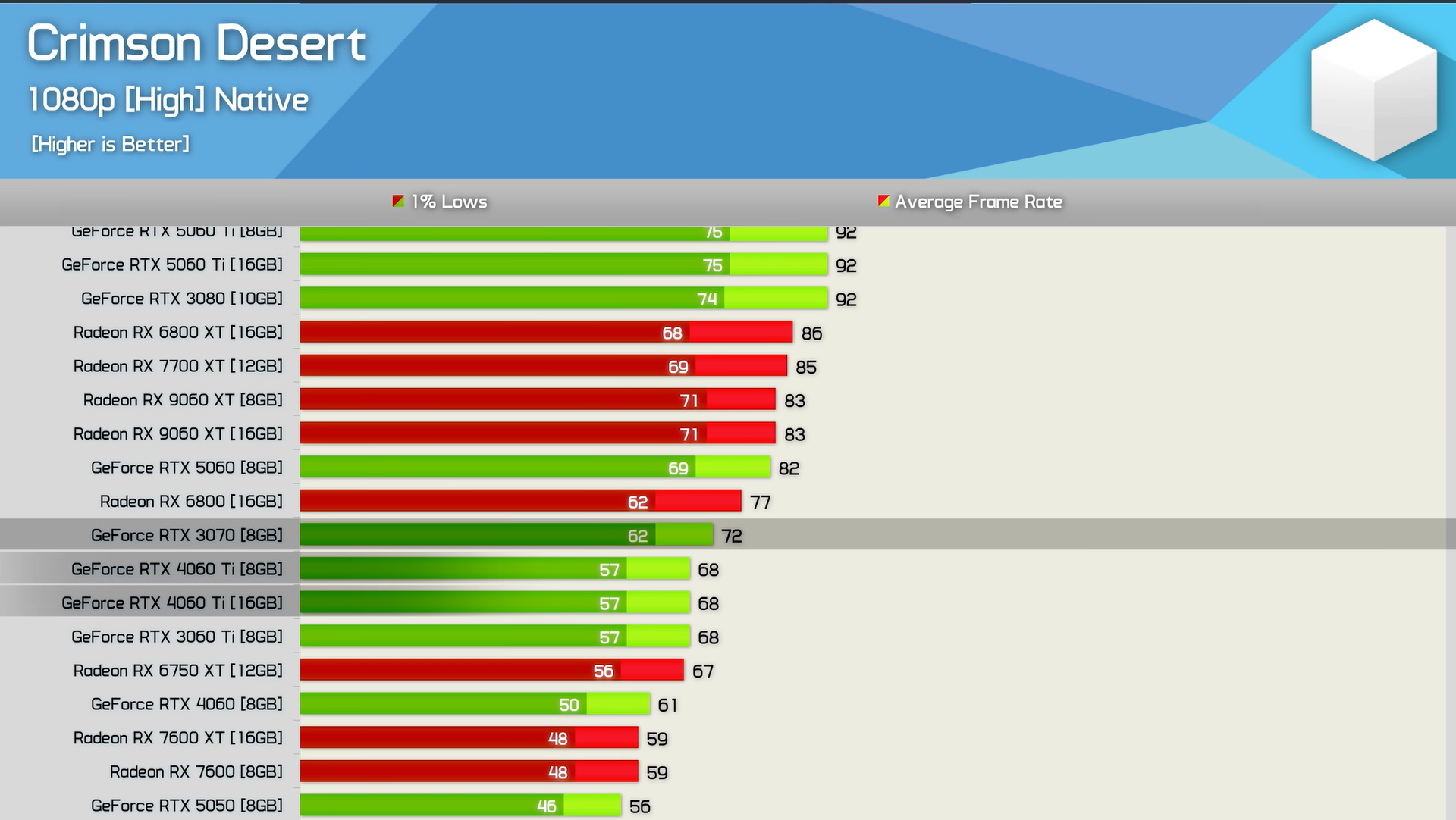 En yüksek kalitede "Sinematik" ön ayarıyla 1080p'de Crimson Desert yalnızca bir RTX 3060 Ti 8 GB VRAM ile 60 FPS ortalamasına ulaşmak için. Bununla birlikte, bir RTX 4060 Ti 50'lerin ortalarında %1'lik düşük değerlerle oyunu sorunsuz bir şekilde oynamak için. Bu nedenle RTX 5060 ve RX 9060 gibi uygun fiyatlı modern GPU'lar Crimson Desert'ı istikrarlı bir şekilde 60+ FPS'de çalıştırabilir.