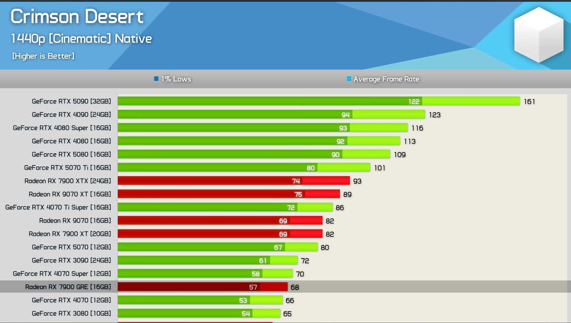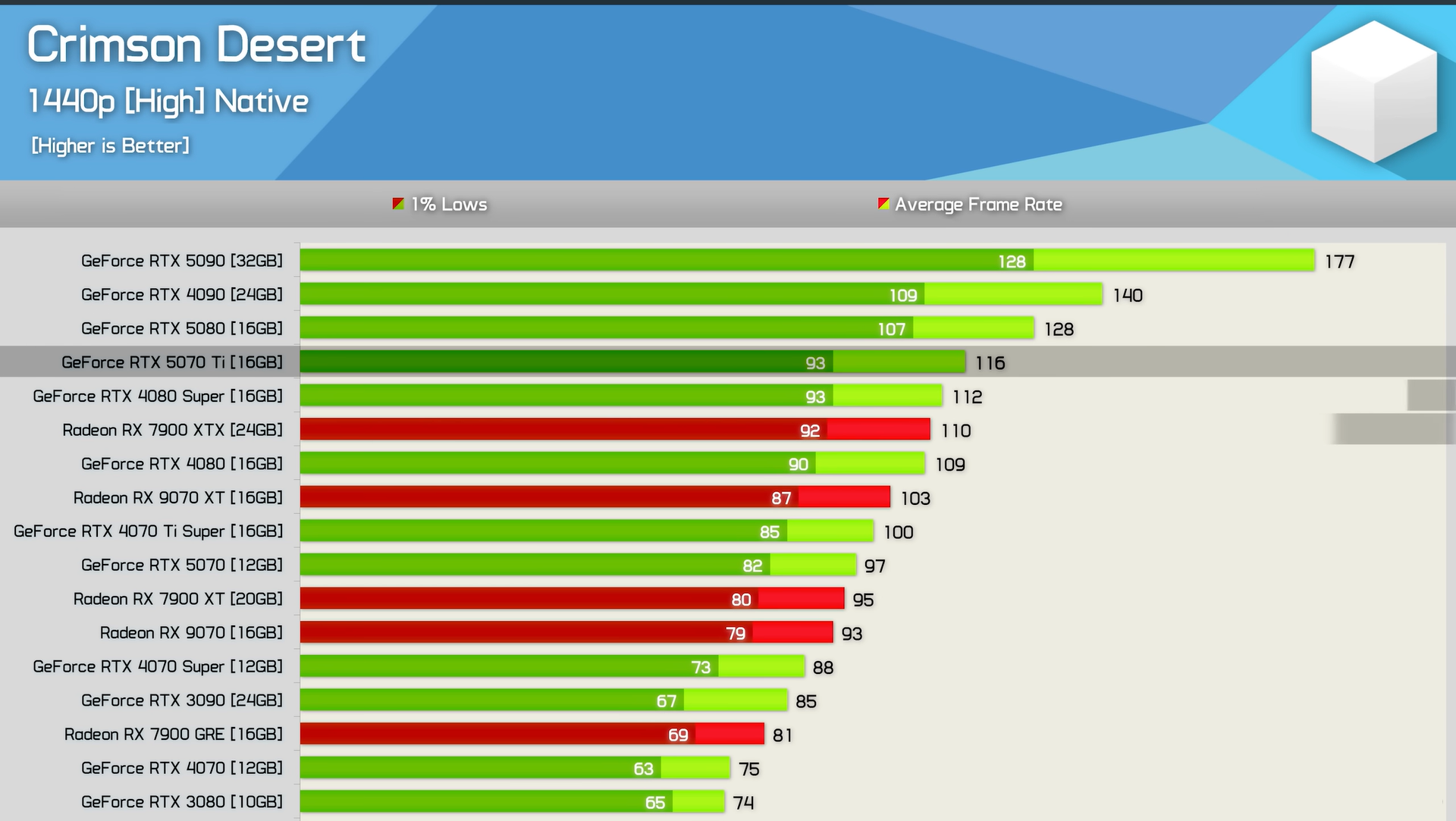 Bu nedenle, Crimson Desert 'ta yüksek yenileme hızına sahip 1440p oyun deneyimi için RTX 5070 TirTX 5080 ve RTX 5090. Bununla birlikte, "Yüksek" ayarlara düştüğünüzde, RTX 5070 bile size yaklaşık 100 FPS sağlayabilir.