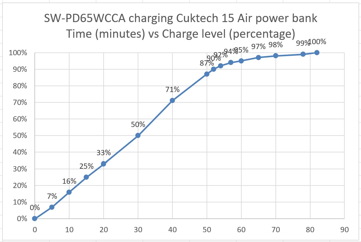 Bir Cuktech 15 Air güç bankası (57,75 Wh), birlikte verilen 6A USB-C kablosunu kullanırken bir Cuktech 10 Ultra (maksimum 100 watt USB-C çıkışı) ile bir SW-PD65WCCA (maksimum 65 watt USB-C çıkışı) arasında yaklaşık beş dakikalık bir farkla biraz daha hızlı tam şarja ulaştı. Şarj hızı doğrusal değildi çünkü çoğu lityum iyon pil %0'dan %80'e kadar daha hızlı, ardından güvenlik için %100'e kadar daha yavaş şarj olur.
