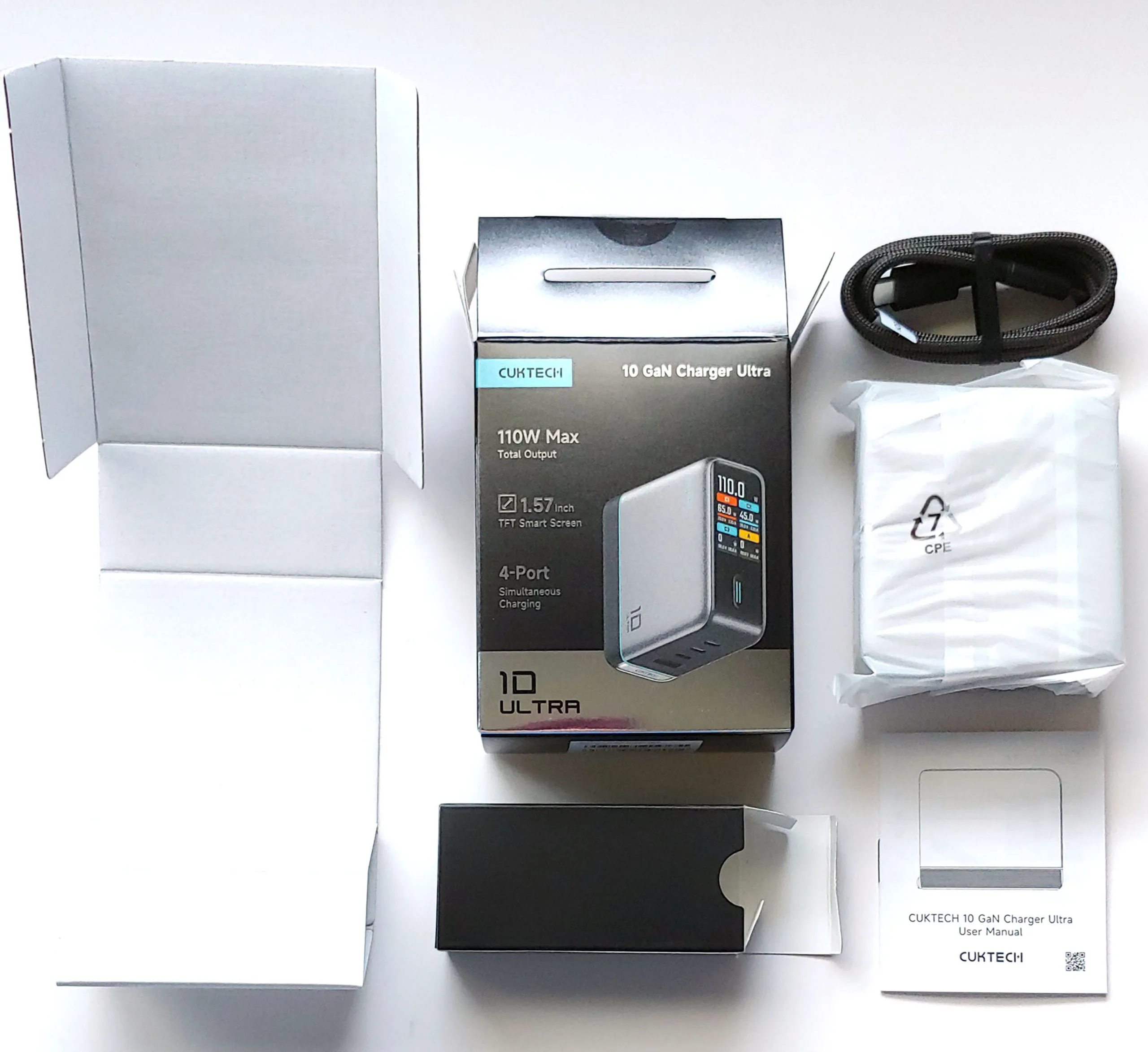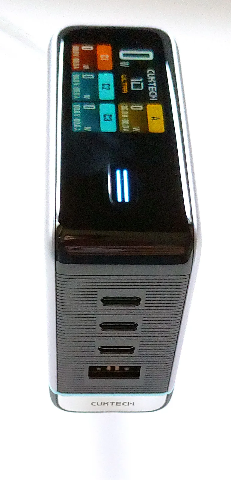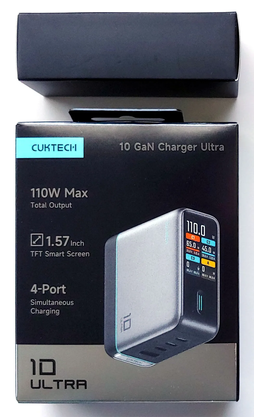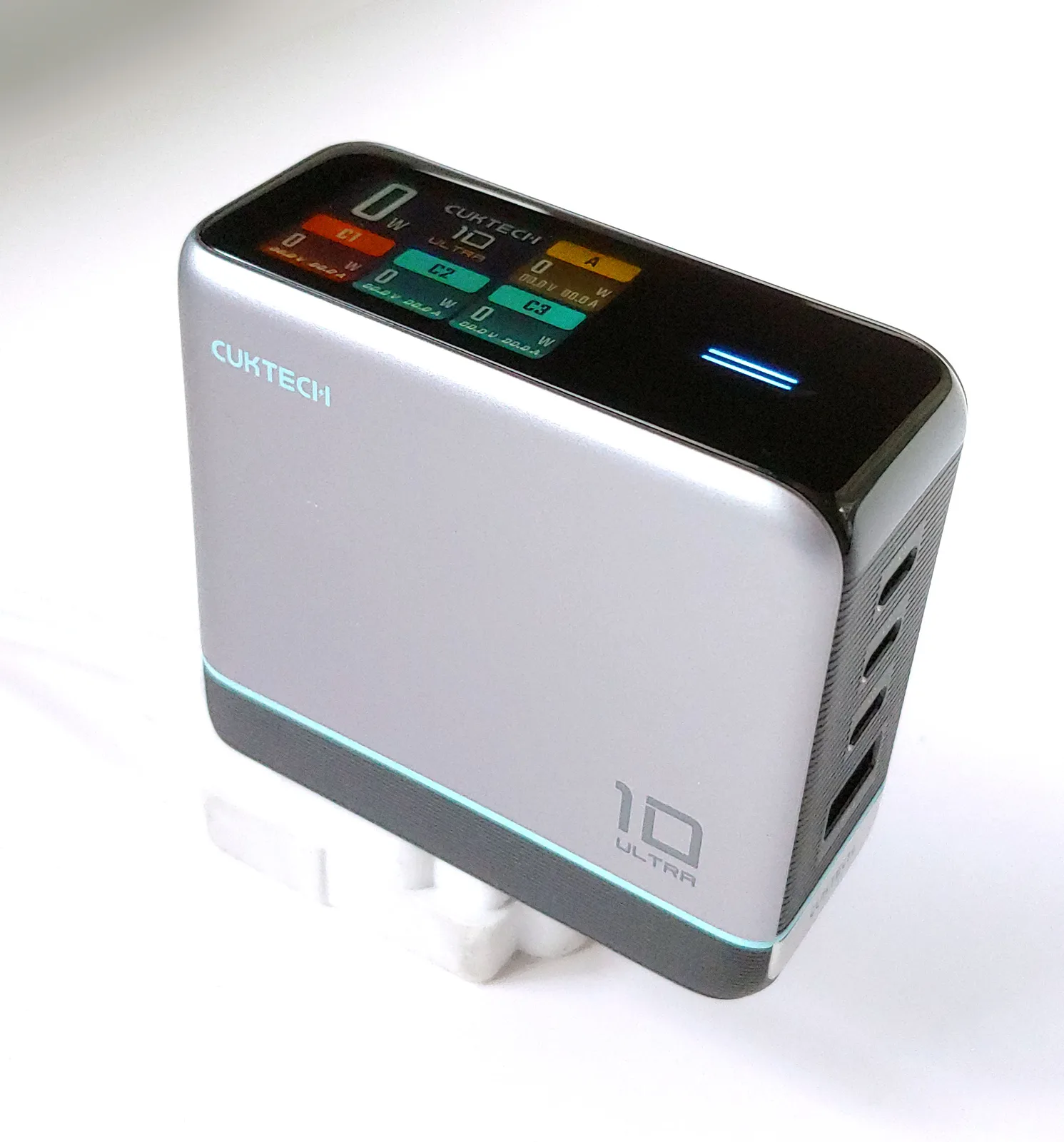 Bu Cuktech 10 Ultra maksimum 100W tek bağlantı noktası çıkışı ve 110W birleşik çıkış ile dört adede kadar USB cihazını hızlı şarj eder. Renkli ekranı, şarj ilerlemesini izlemeye yardımcı olmak için bağlantı noktası başına, gerçek zamanlı watt, voltaj ve amperajı gösterir. Dokunmatik bir düğme çeşitli ekran modlarına ve ayarlarına erişir.