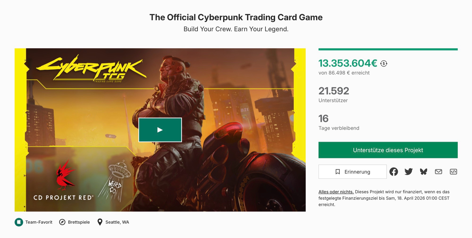 Oyun, Kickstarter'da 21.500'den fazla müşteriden 15,4 milyon dolar. Bu da Cyberpunk TCG'nin çoğu video oyununu bile geride bıraktığı anlamına geliyorşu anda neredeyse bir milyar ABD doları toplamış olan Star Citizen hariç. WeirdCo bu başarıyı sadece Cyberpunk markasının gücüne değil, her şeyden önce oyunun yol haritasını etkileyen haftalık anketlere yansıyan toplulukla yakın işbirliğine bağlıyor