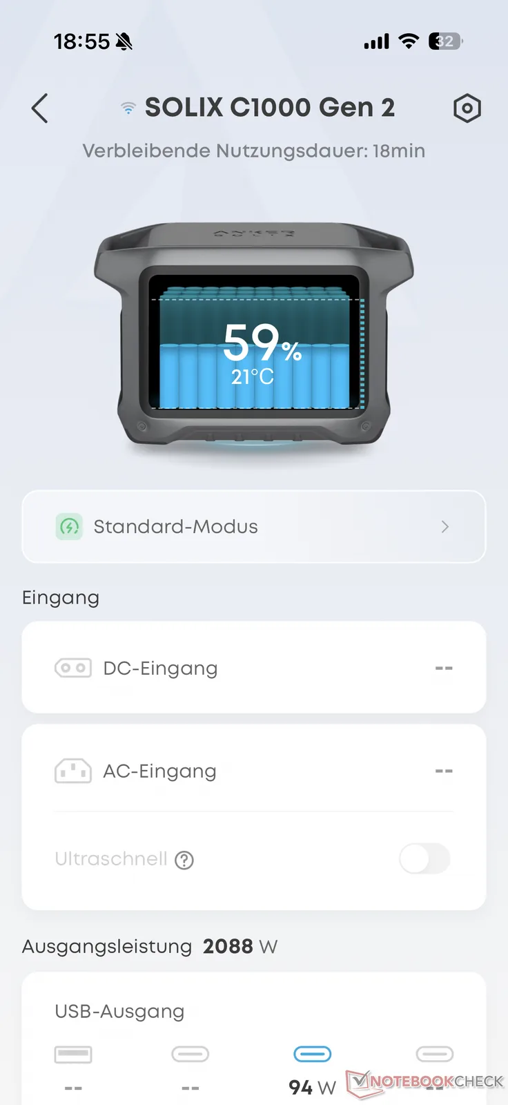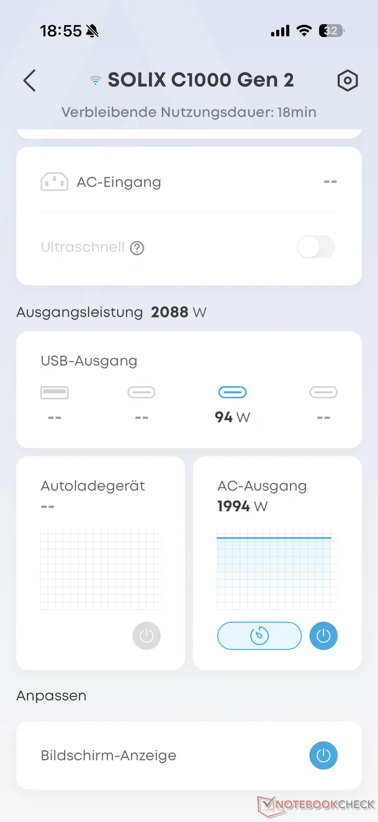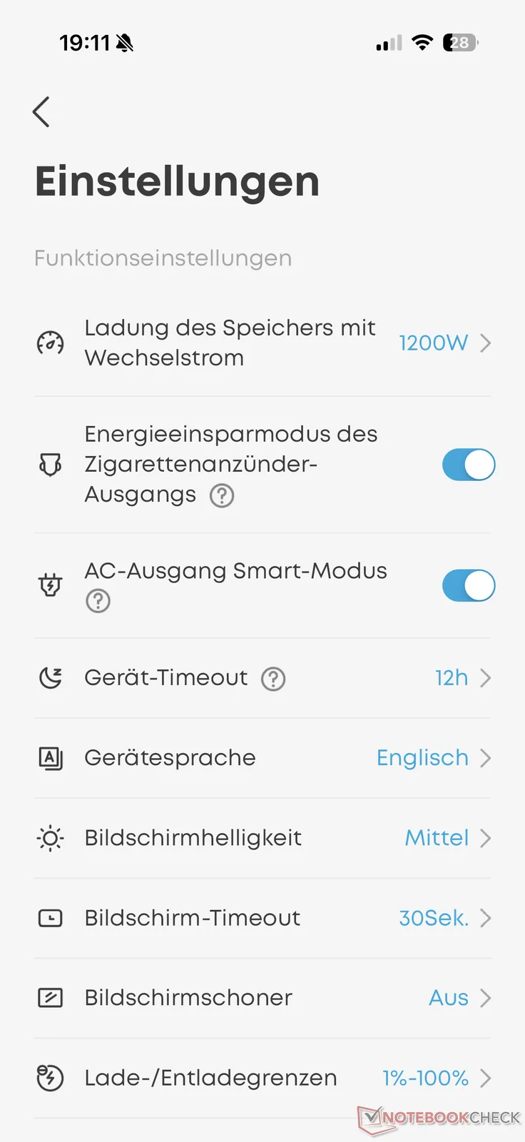 Uygulama ayrıca batarya şarj seviyesi ve mevcut çıkış gücünde kalan kullanım süresinin yanı sıra batarya hücrelerinin sıcaklığı gibi bilgiler de sağlar. Menüde maksimum şarj hızı, enerji tasarrufu, şarj ve deşarj limitleri ve ekranın tüm yönleri için çeşitli ayarlar yapılabilir. Ürün yazılımı güncellemeleri de burada mümkündür.