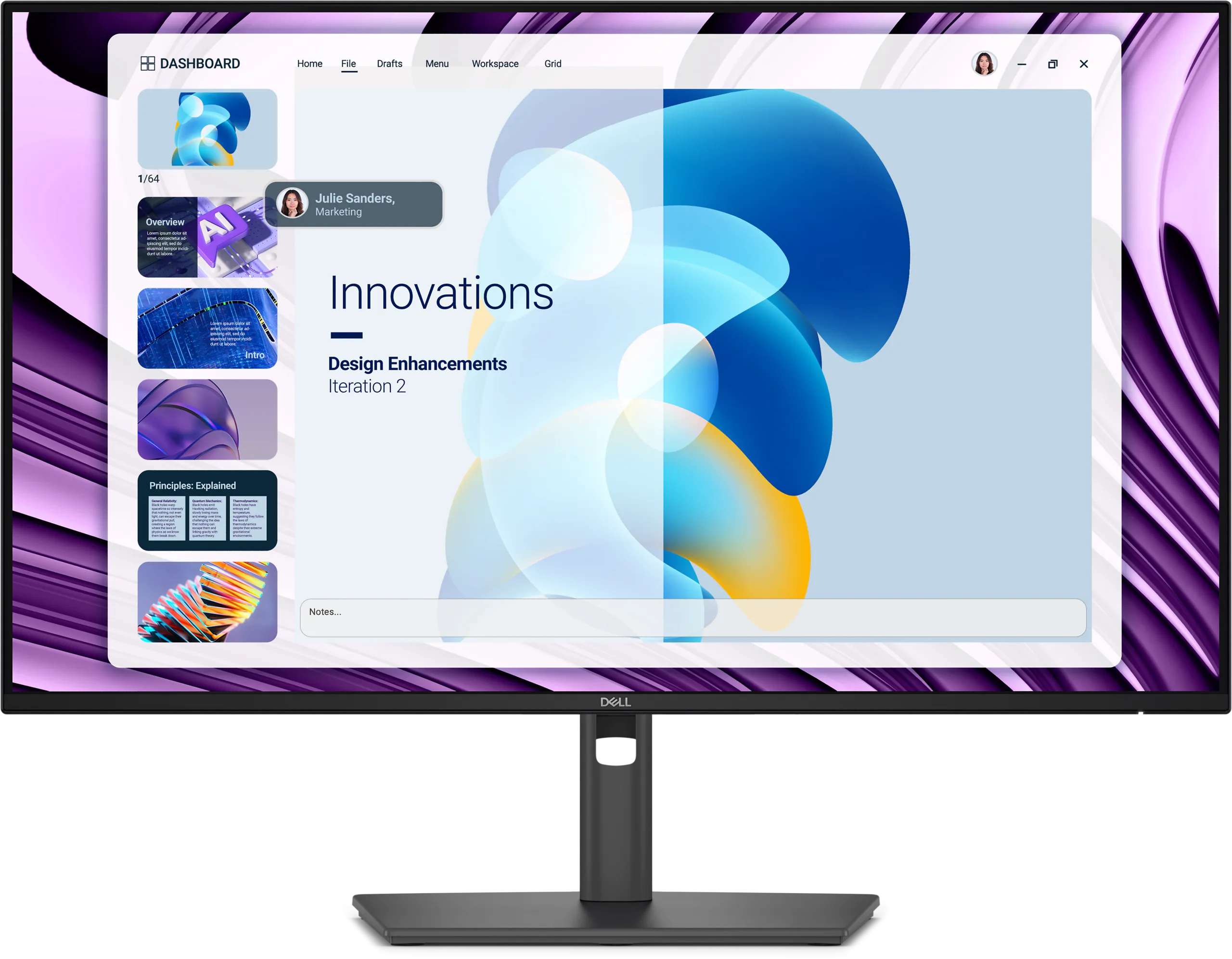 Monitör 1920 × 1080 çözünürlüğe, 16:9 en boy oranına, 120Hz yenileme hızına ve 8ms tepki süresine sahip. Dell, ekranın parlama önleyici sert bir kaplamaya sahip olduğunu ve monitörün öne veya arkaya doğru eğilebildiğini, 45°'ye kadar yana döndürülebildiğini ve hatta yataydan dikeye 90° döndürülebildiğini söylüyor. Kullanıcılar ayrıca yüksekliği 150 mm'ye kadar ayarlayabiliyor.