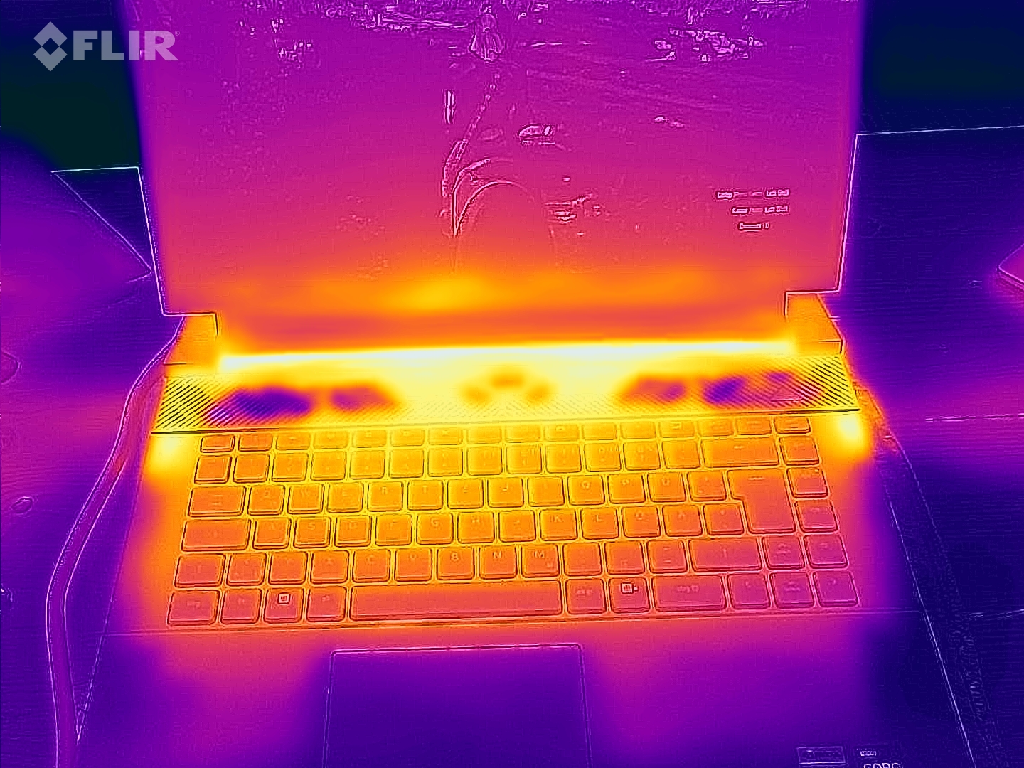 Bununla birlikte, cihazın nispeten düşük gürültü emisyonları da bazı küçük dezavantajlara sahiptir. G16'nın yüzeyi rakiplerine göre daha fazla ısınma eğilimindedir. Maksimum yük altında alt tarafta 58 °C'ye varan sıcak noktalar ölçtük! Sadece Lenovo LOQ 16 ve G16'nın selefi benzer şekilde ısınırken, diğer karşılaştırma cihazları 50 °C'nin hemen altında kalıyor. En azından avuç içi dayanakları her zaman serin ve WASD tuşlarını çevreleyen alan da kabul edilebilir bir aralıkta kalıyor.