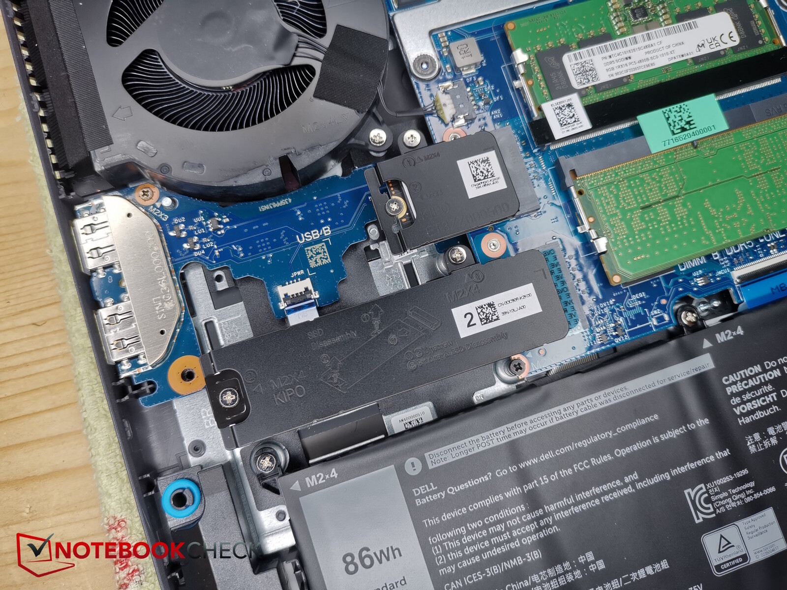 İç kısımda, çoğu oyun rakibinde görülebileceği gibi göze çarpan bakır ısı boruları yok. Fanlara, her iki RAM yuvasına, WiFi modülüne, bataryaya ve her iki M.2-SSD yuvasına erişebilirsiniz, bunlardan yalnızca daha küçük formatlı 2230 olanı doludur.