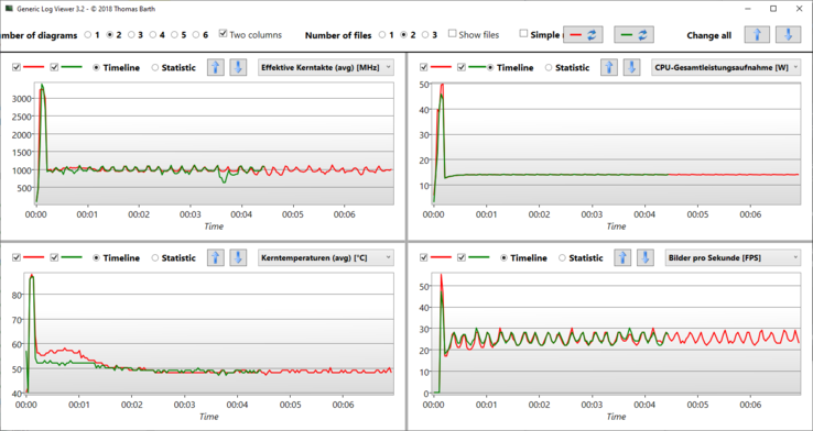 Çok benzer SoC'lere sahip dizüstü bilgisayarların termal kısma açısından ne kadar farklı davrandığını görmek için 'Witcher 3 Güç Tüketimi / Stres Testi' tablosuna göz atmaya değer. Prime 95 ve Furmark'a bakın: Latitude'umuz (64 watt'tan başlar) 30 saniye (44 watt) sonra büyük ölçüde kapanır ve 3 dakika sonra 35 watt'a düşer. ThinkPad X1 Carbon, performansı ve enerji tüketimini küçük adımlarla düşürür, ancak iki dakika sonra büyük ölçüde 35 watt'a düşer. Diğer bir deyişle, X1 Carbon daha uzun bir yük aralığına sahipken, Latitude yalnızca 20-30 saniye maksimum yük kapasitesine sahiptir.